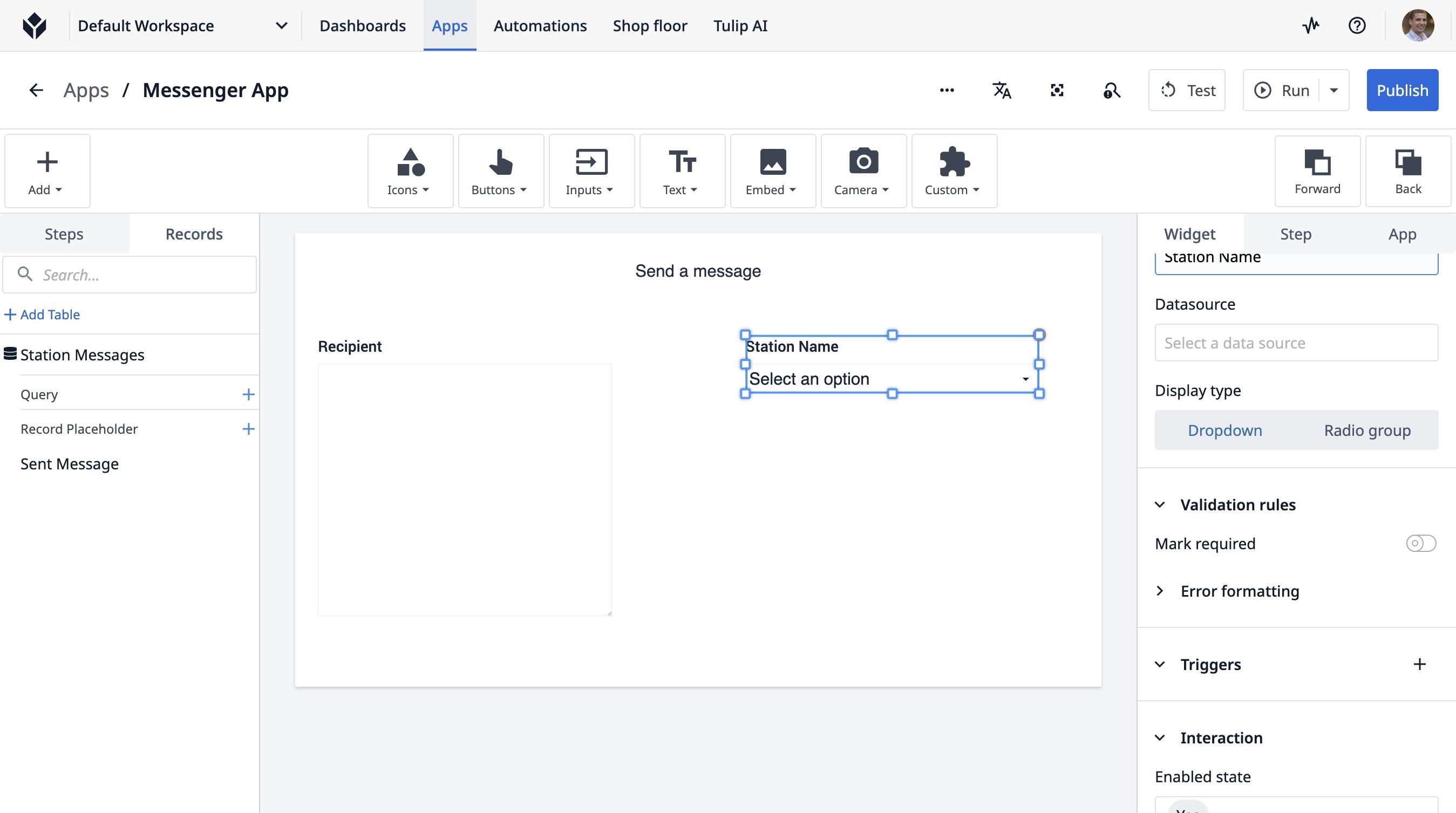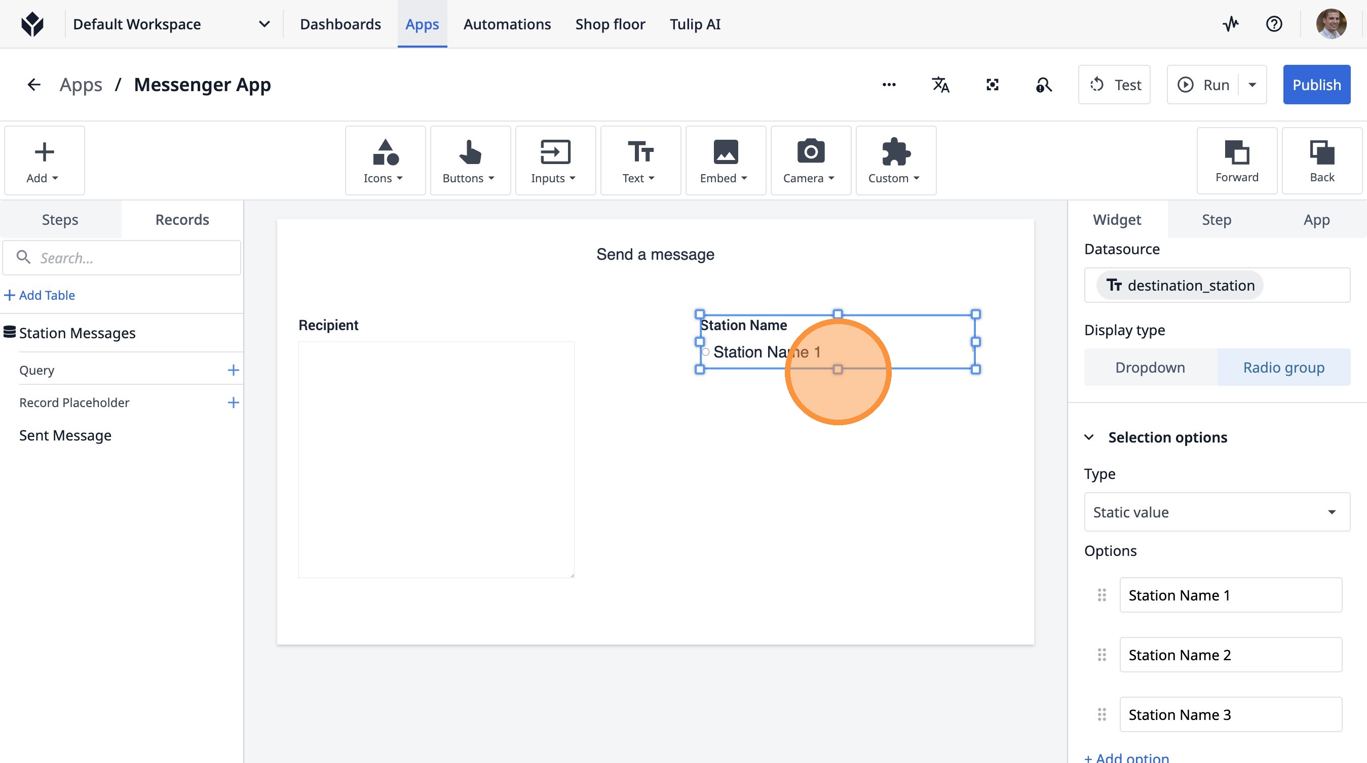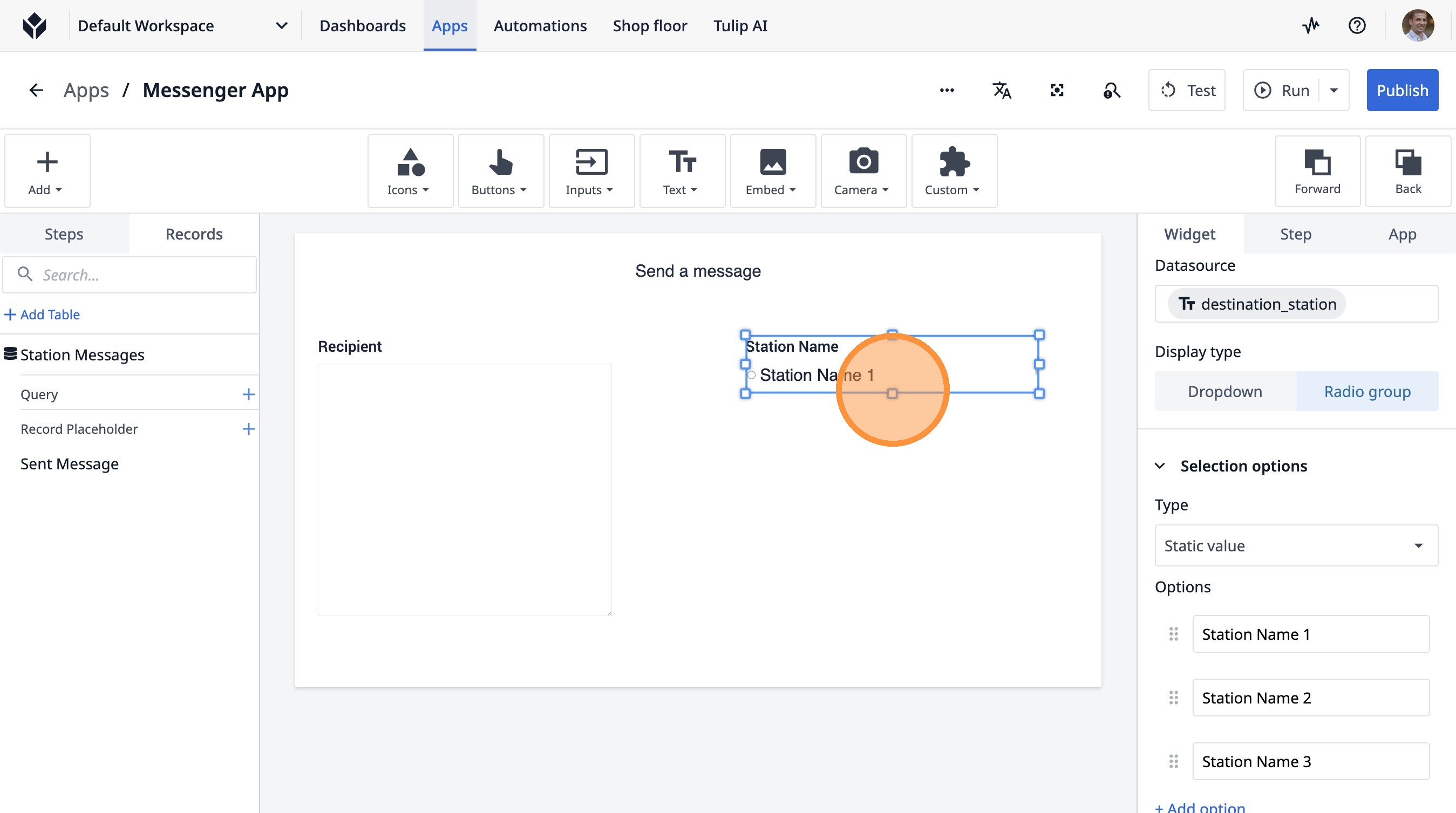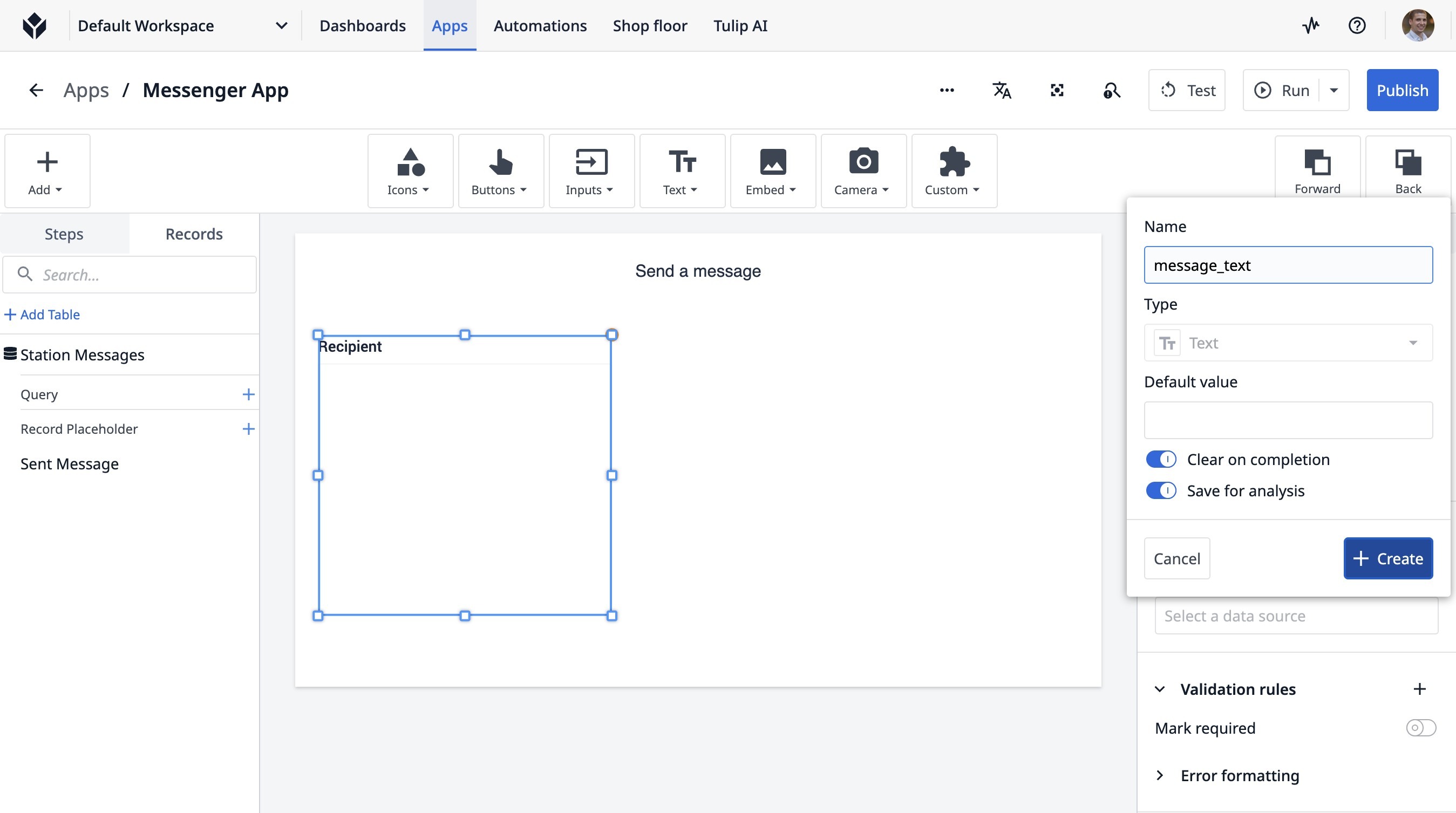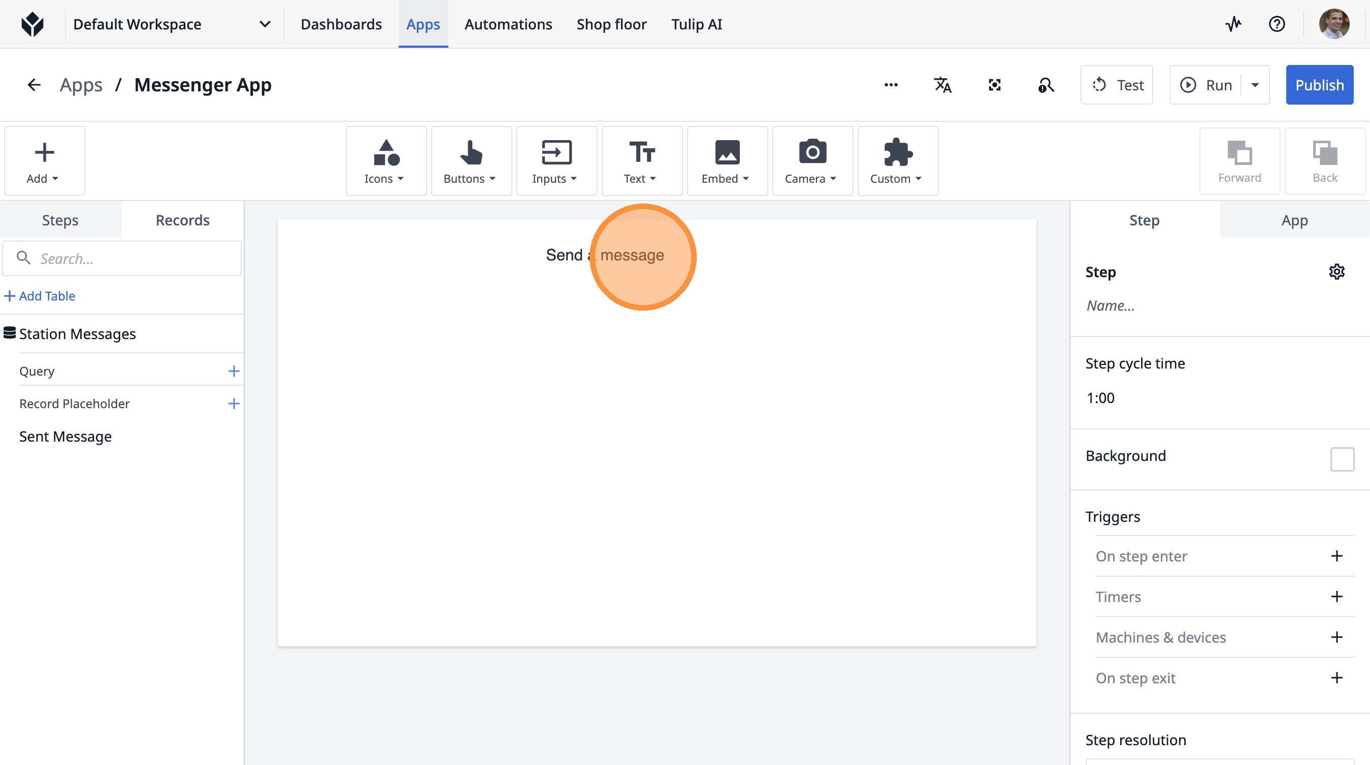Learn how to build a Tulip application that allows users to send messages between stations. This guide covers setting up the app, configuring message records, and implementing the send functionality.