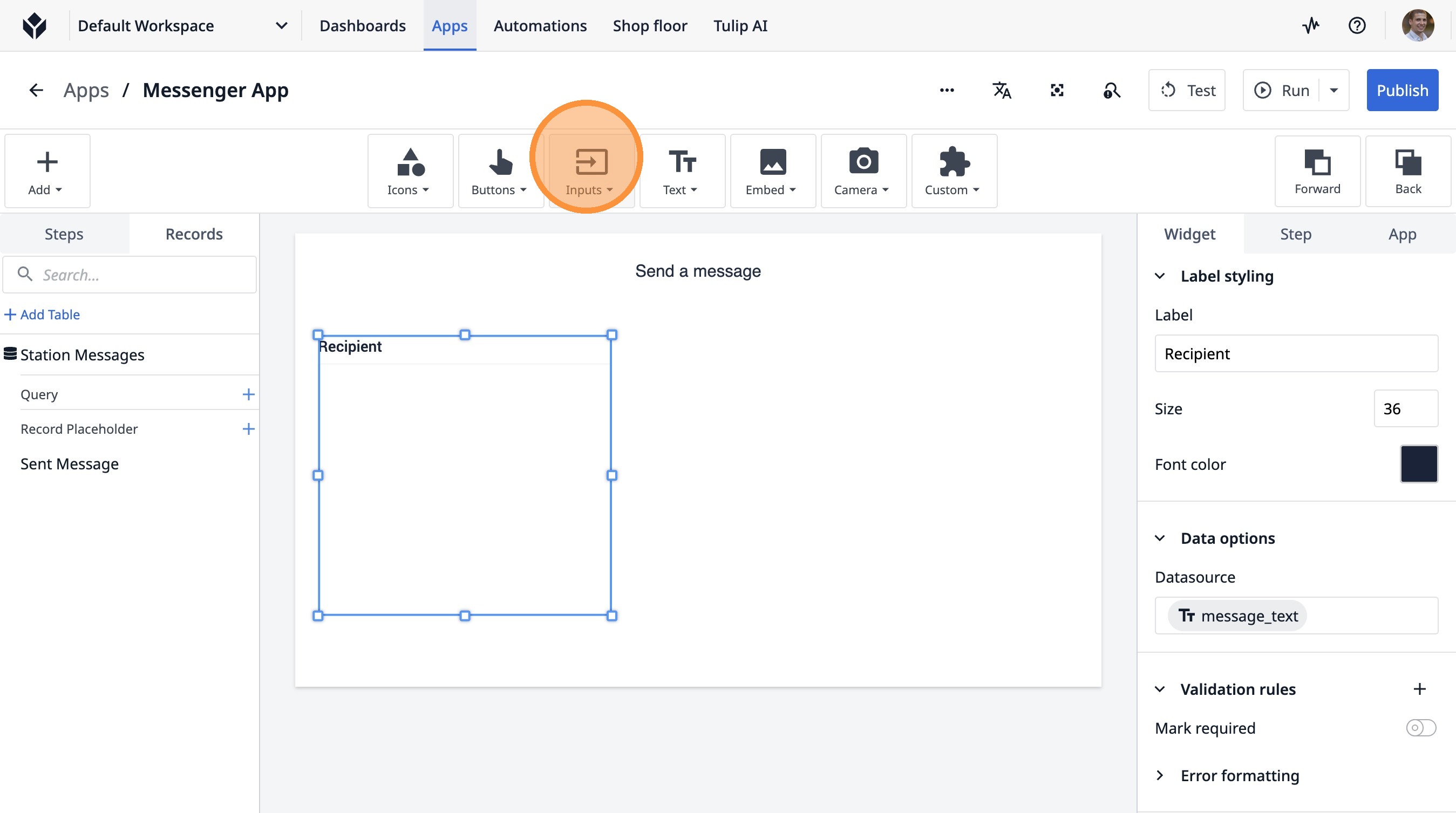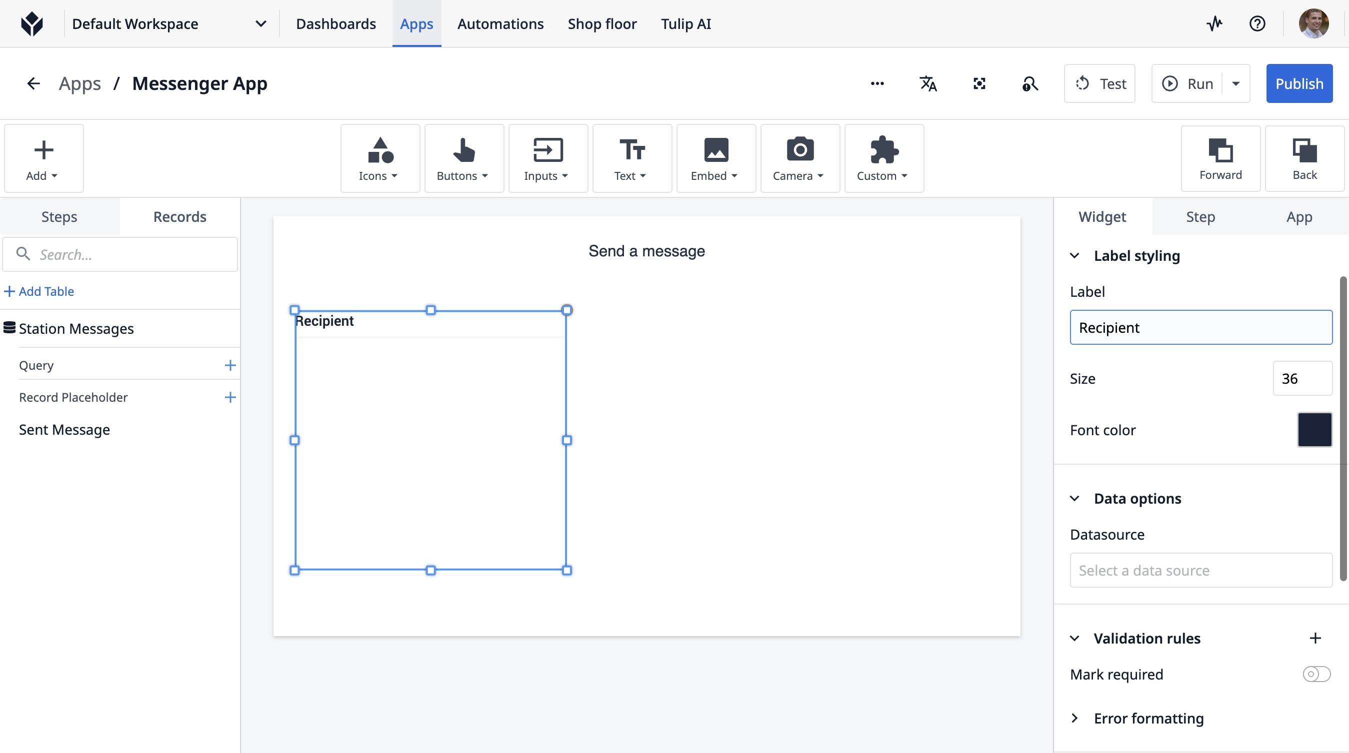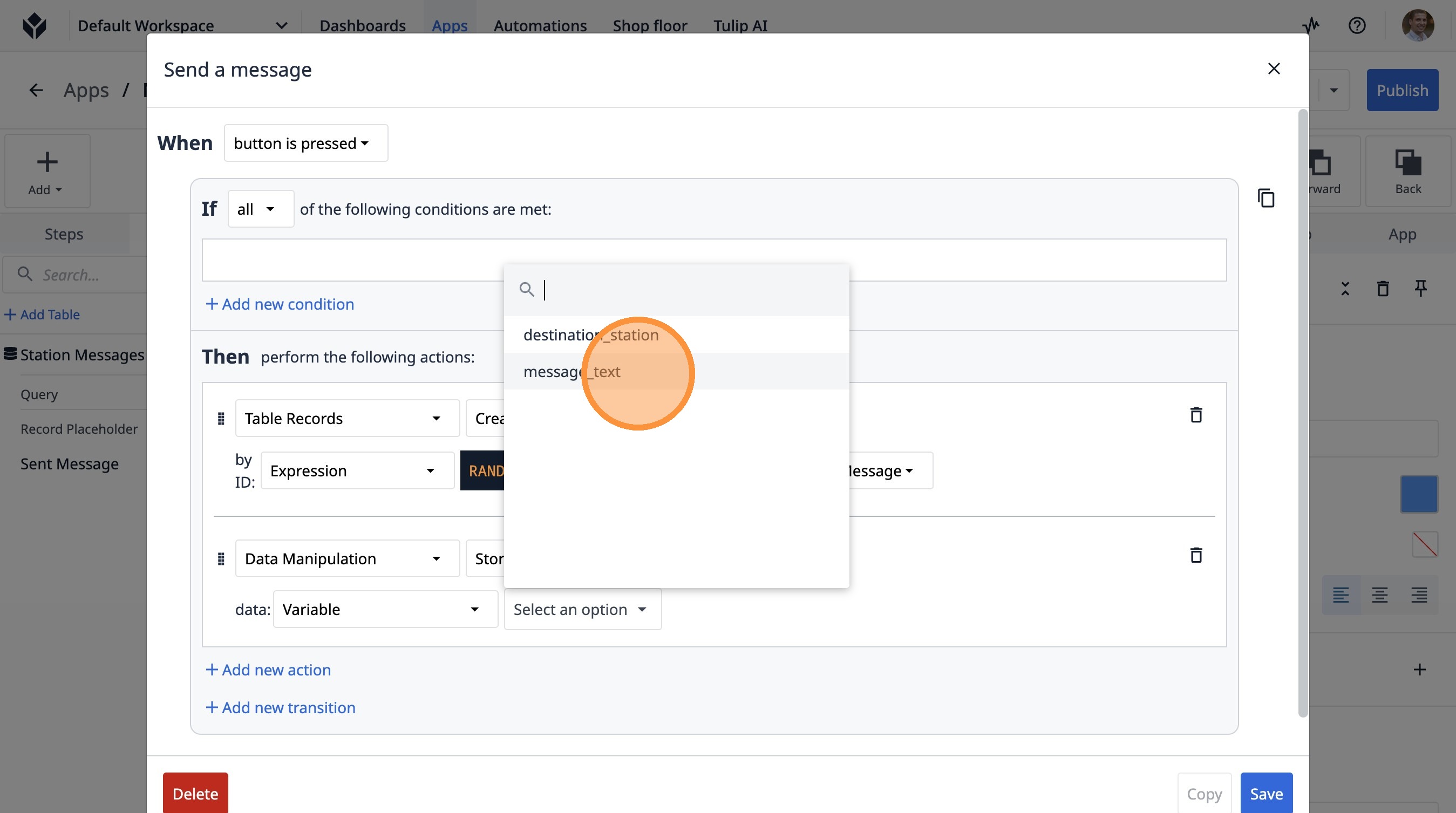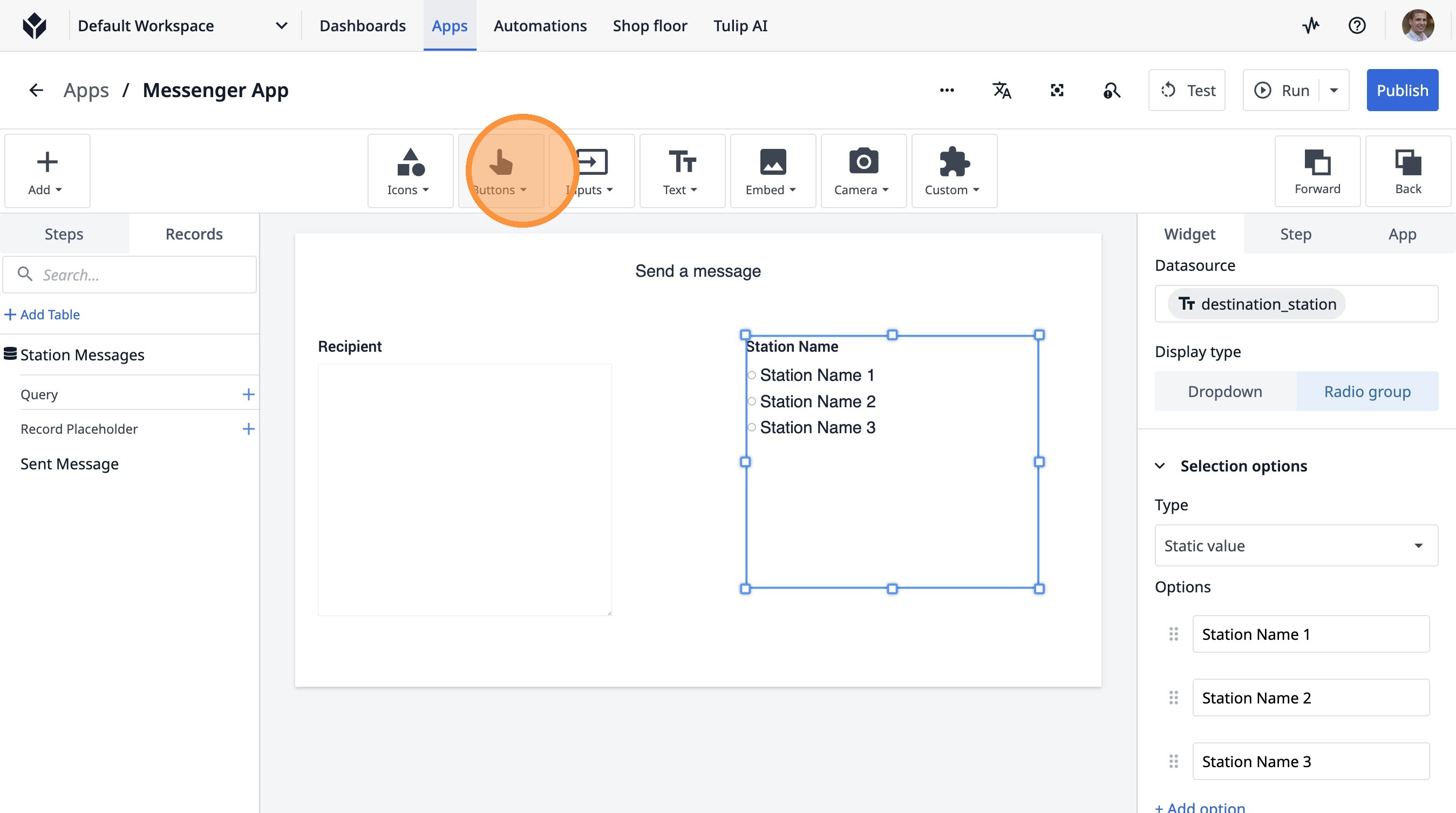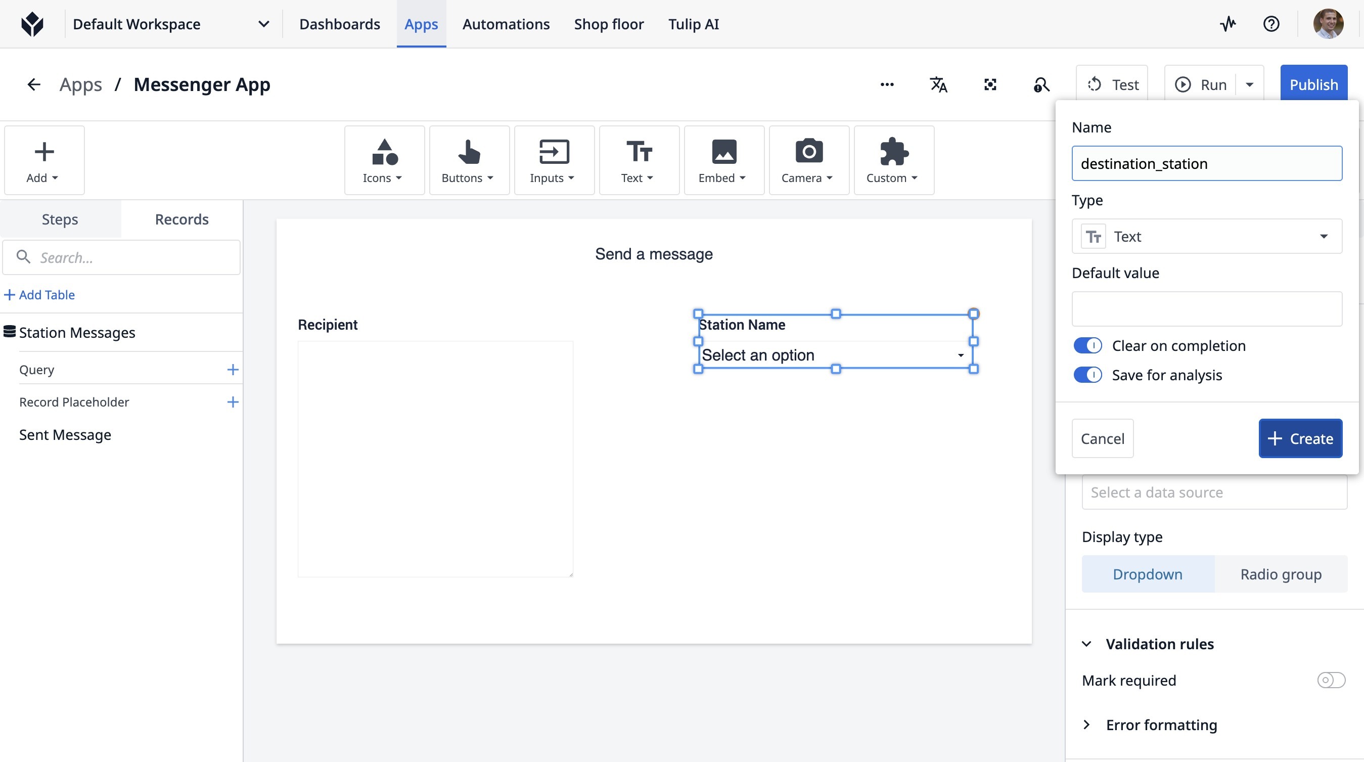 Learn how to build a Tulip application that allows users to send messages between stations. This guide covers setting up the app, configuring message records, and implementing the send functionality.