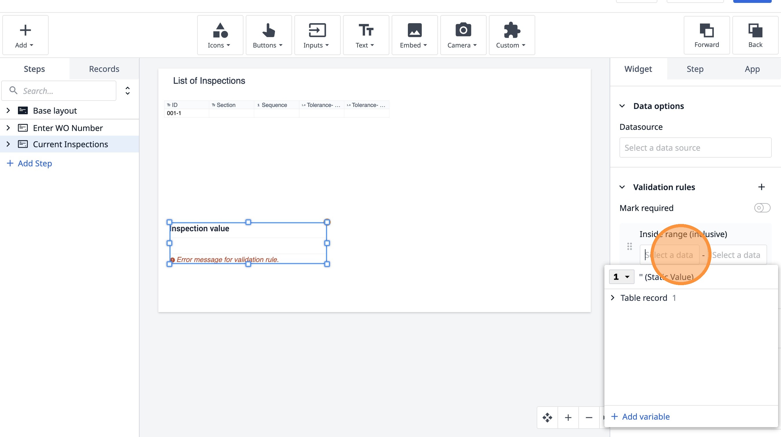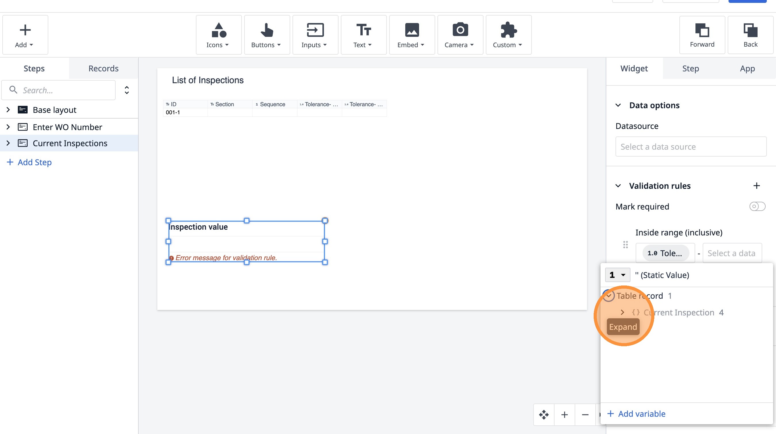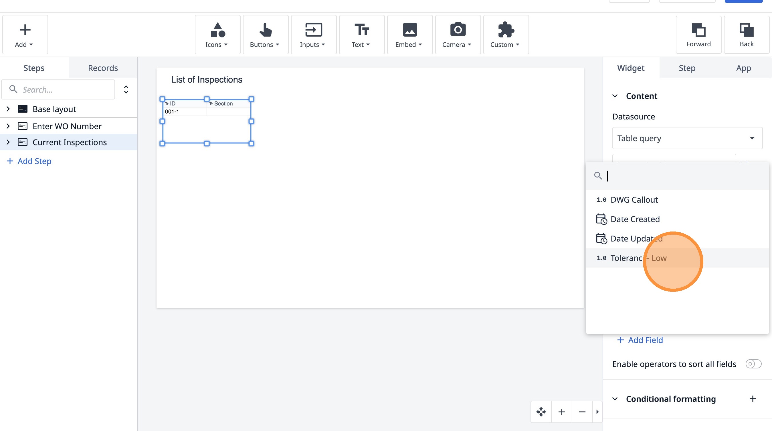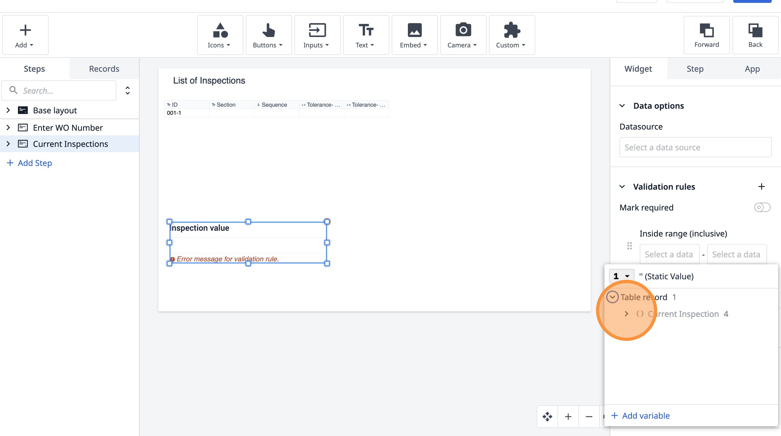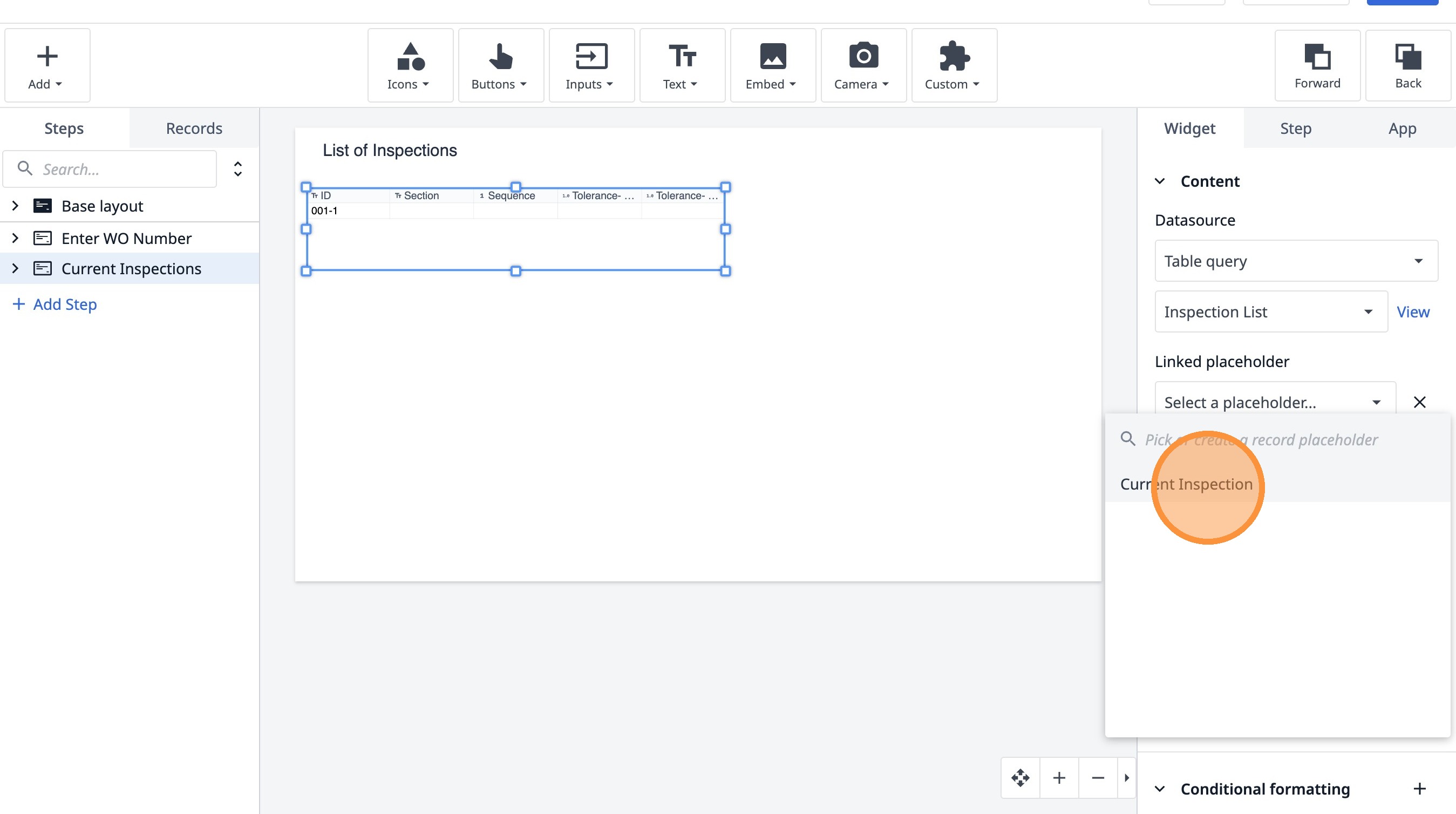 Learn how to build an interactive table widget to display inspection data. This guide will walk you through configuring a table to show inspection details and setting up dynamic data display for improved workflow visualization.