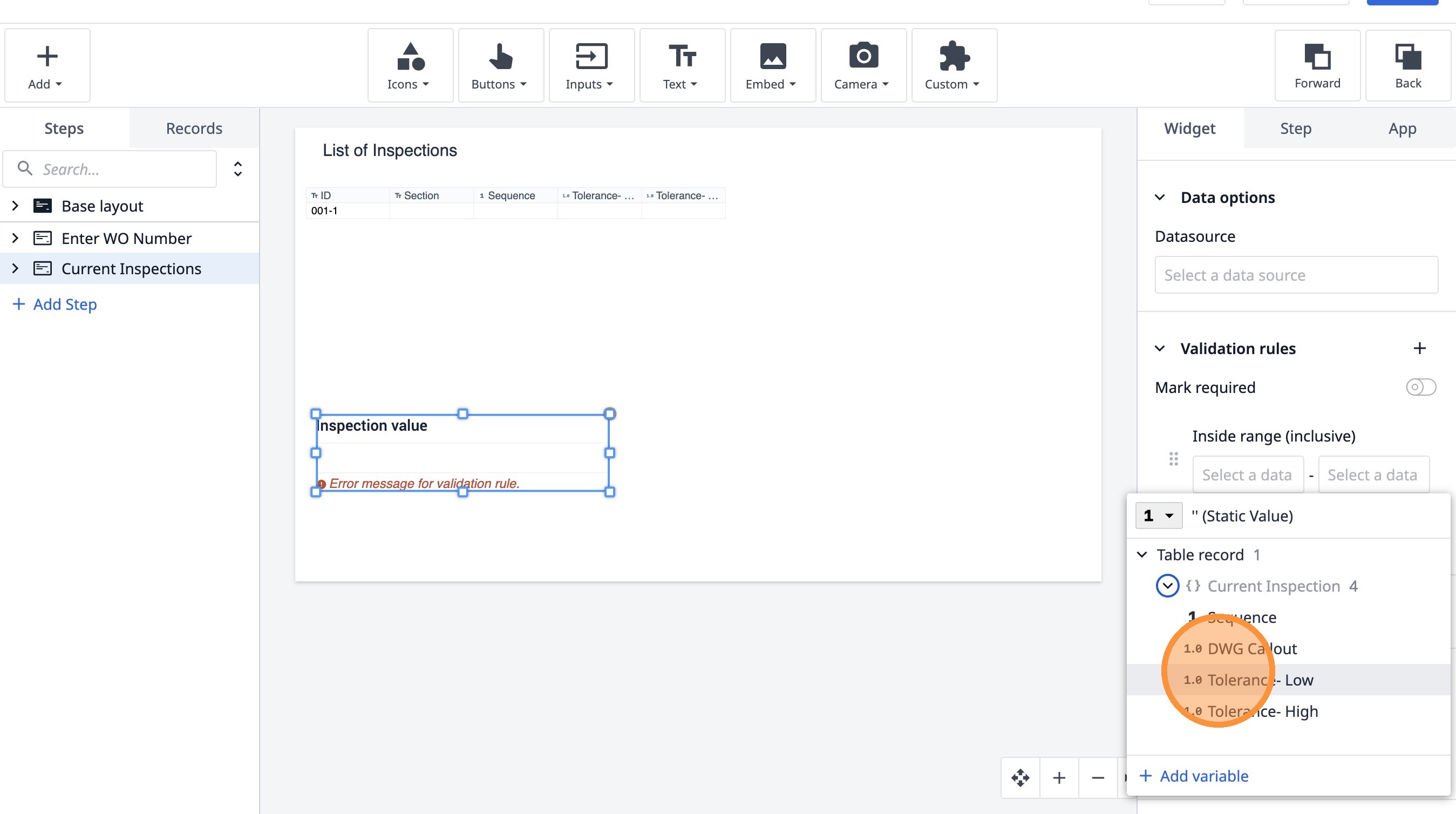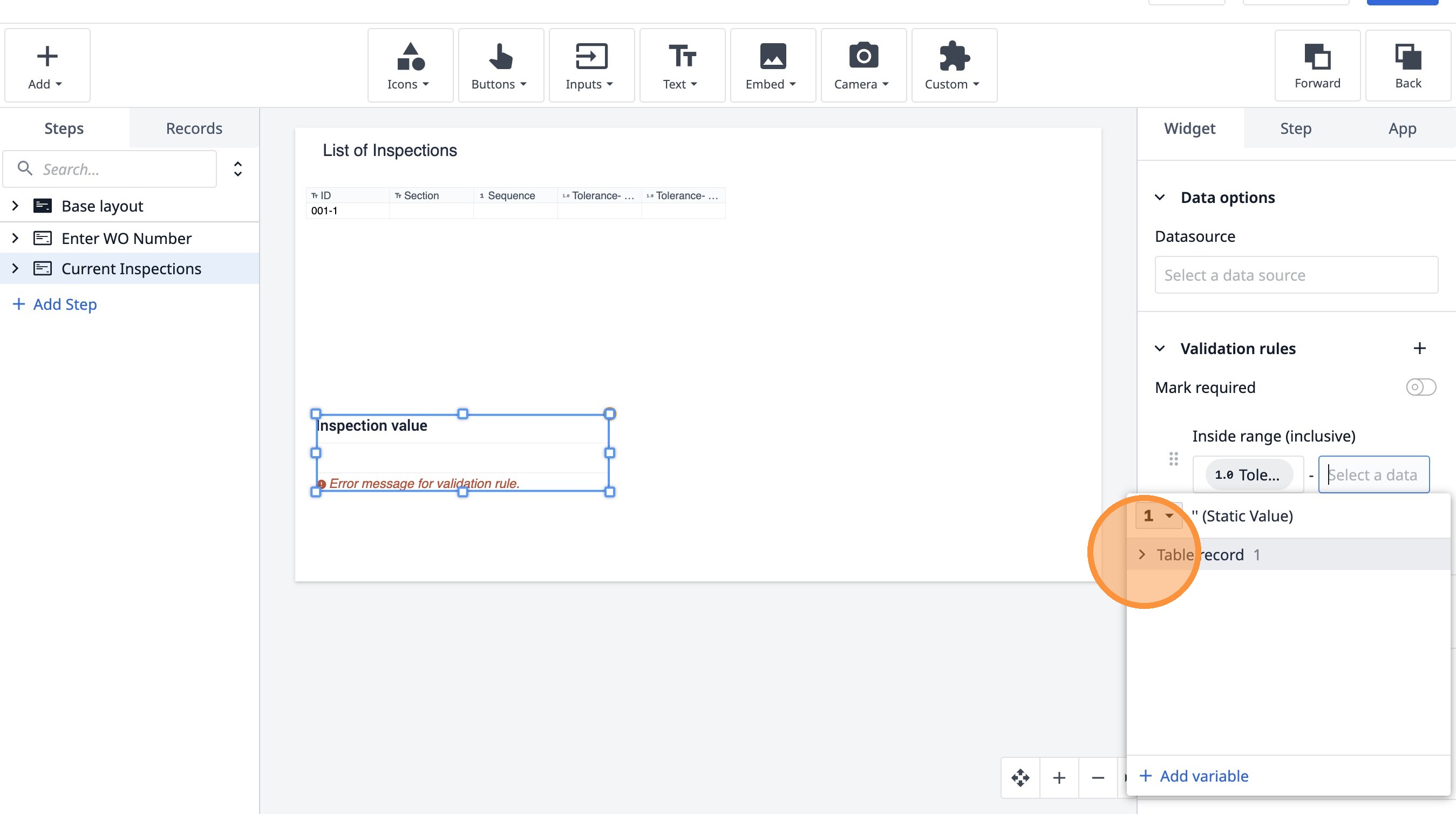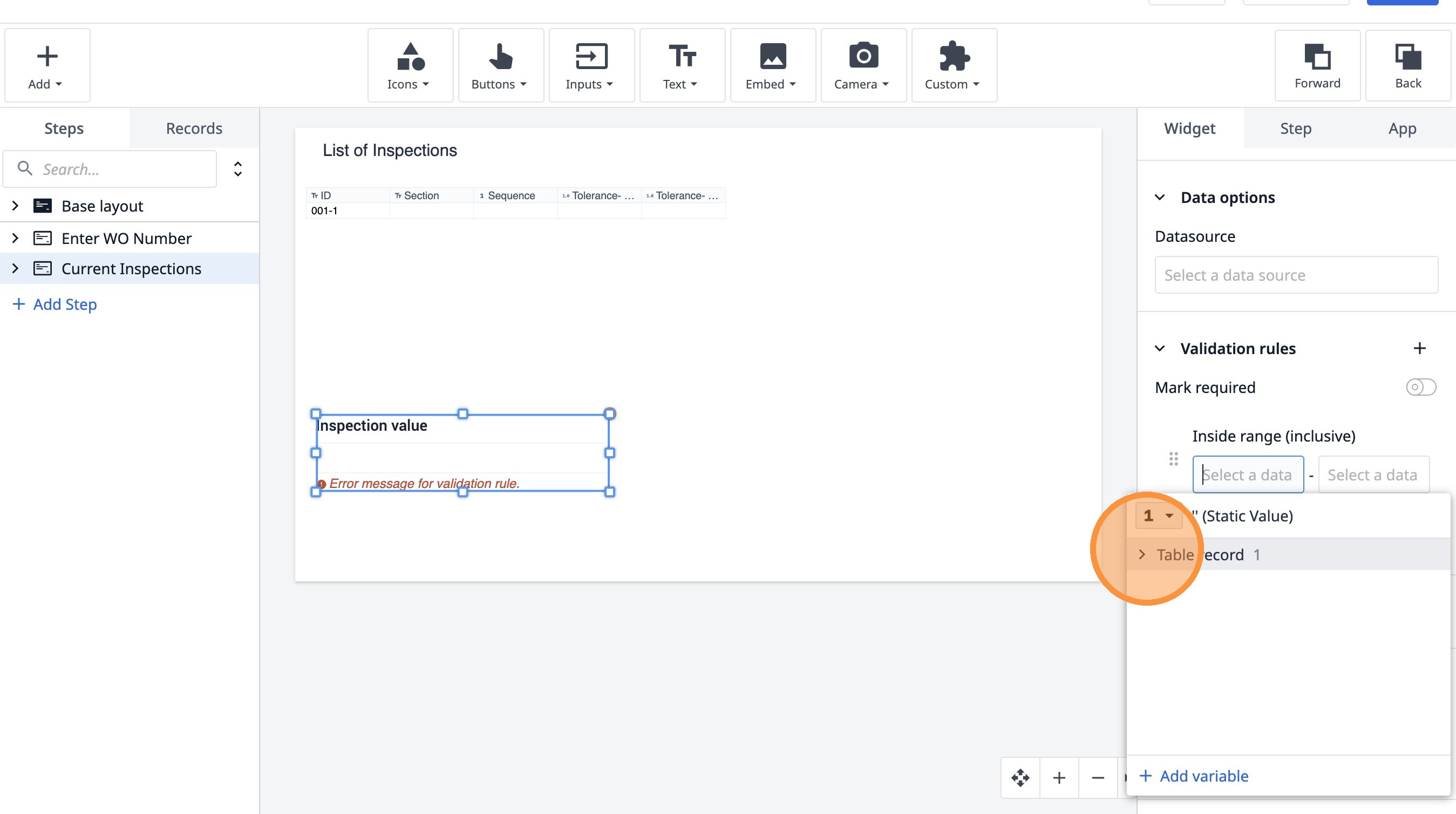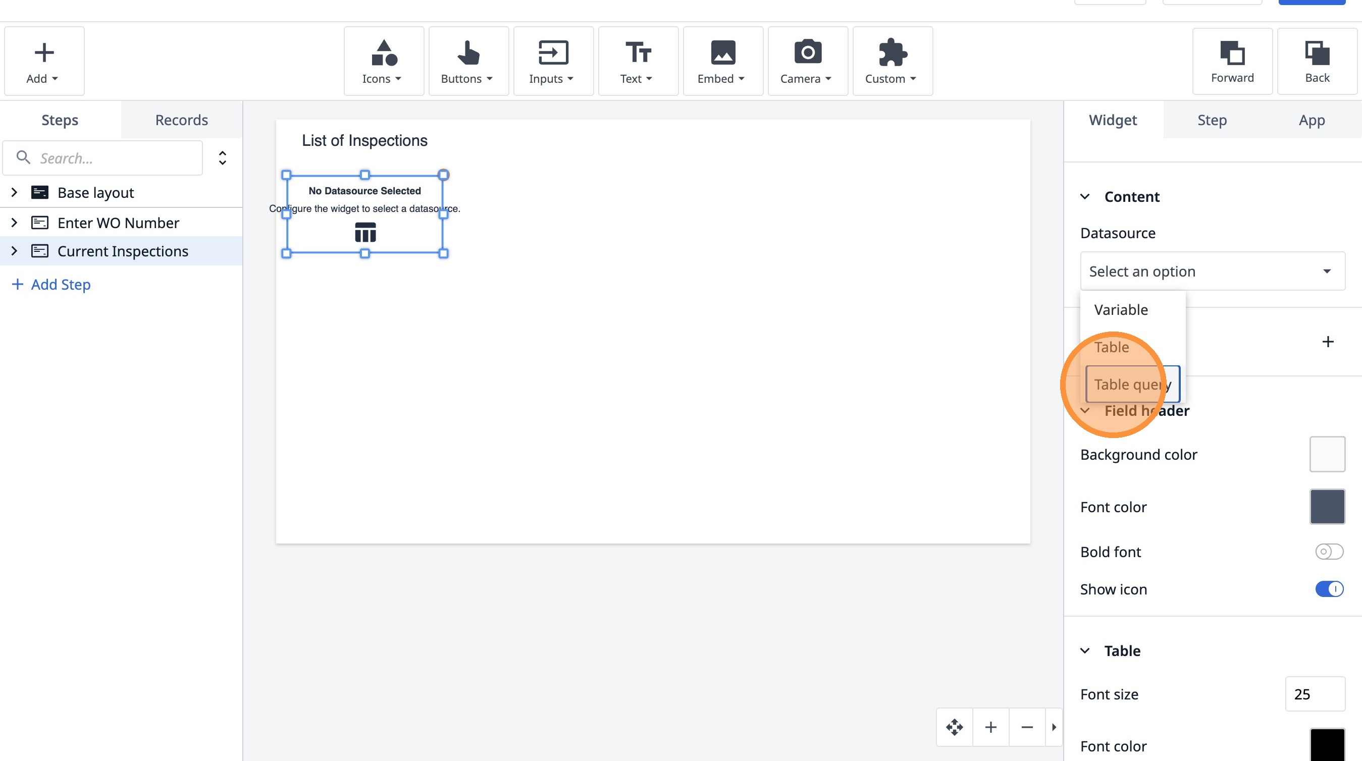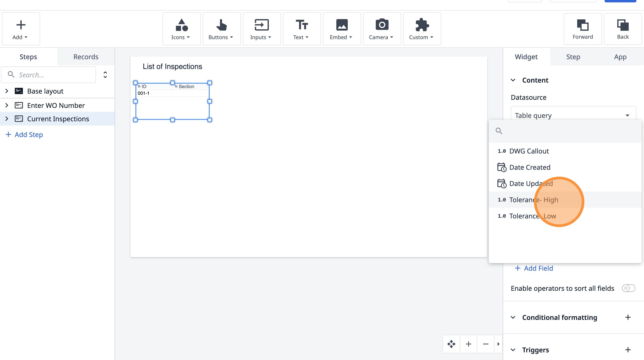 Learn how to build an interactive table widget to display inspection data. This guide will walk you through configuring a table to show inspection details and setting up dynamic data display for improved workflow visualization.