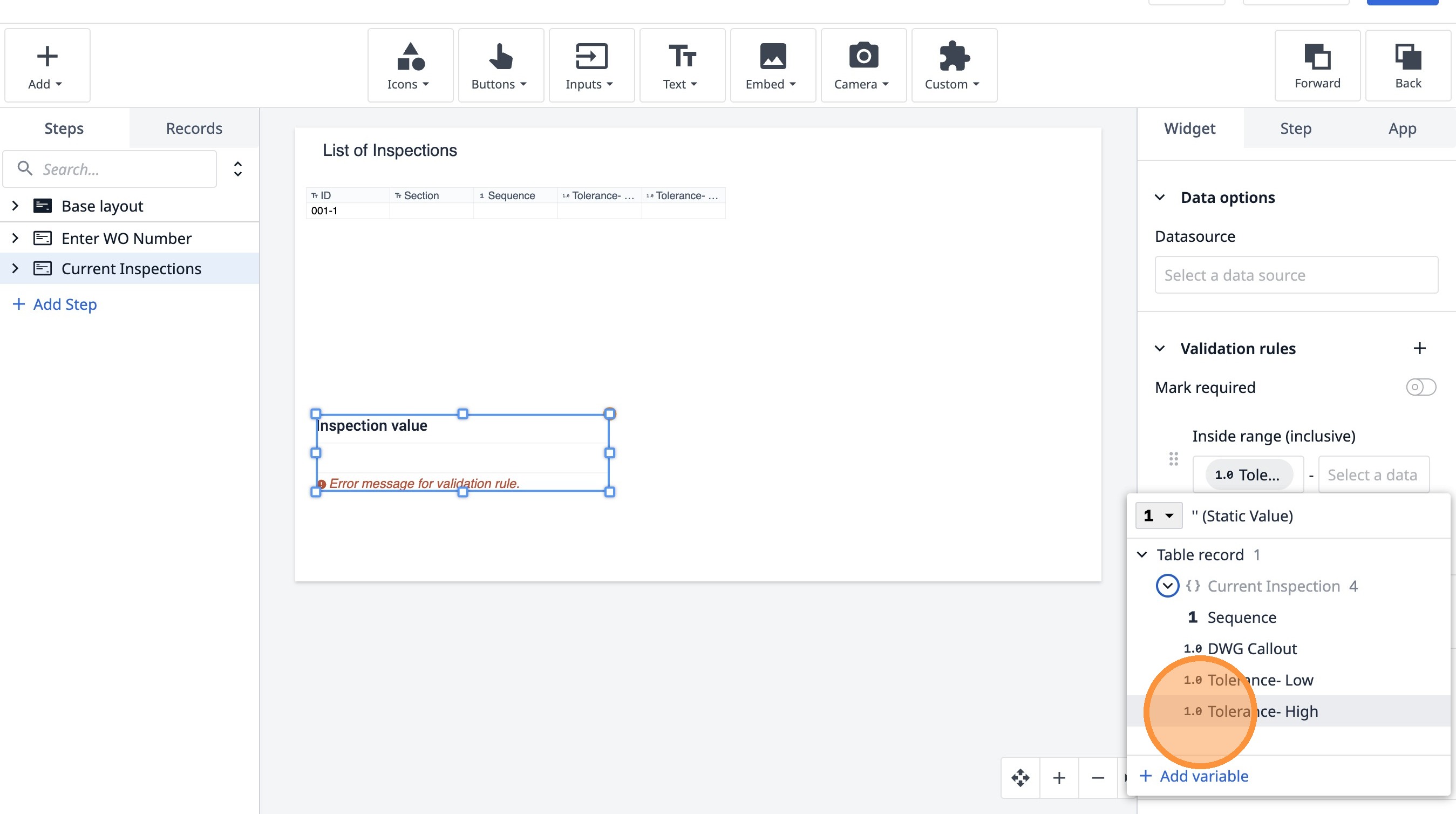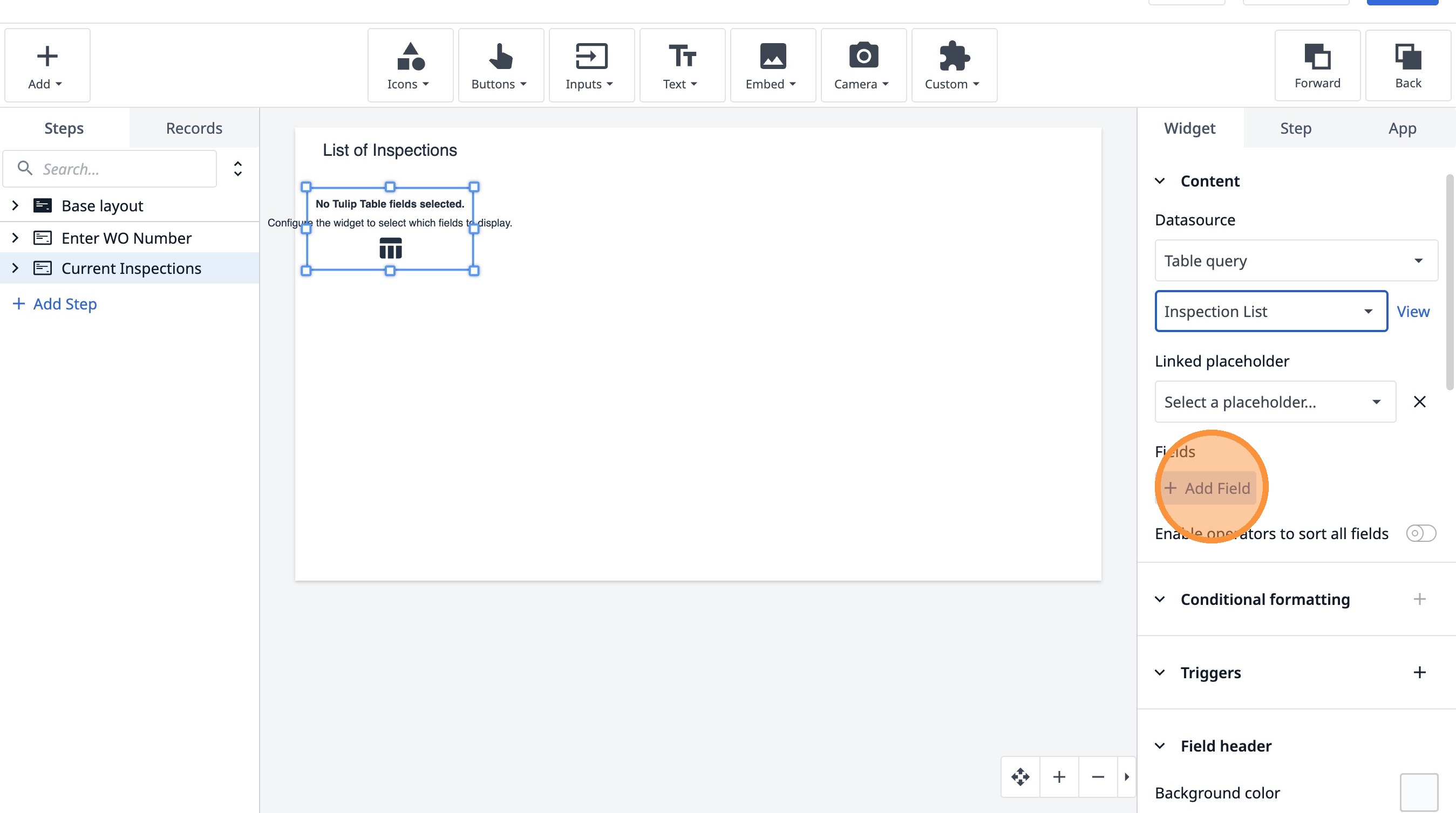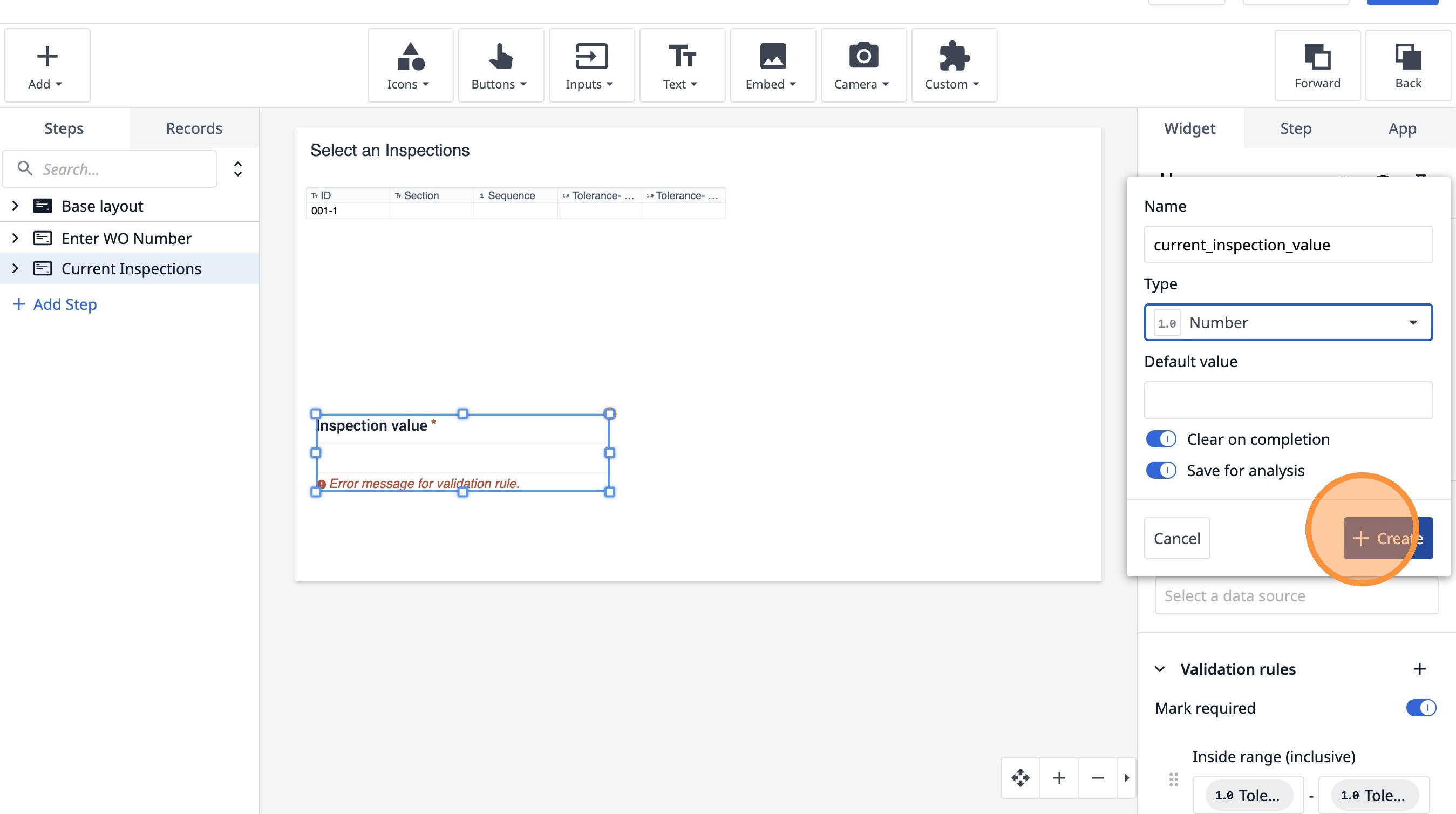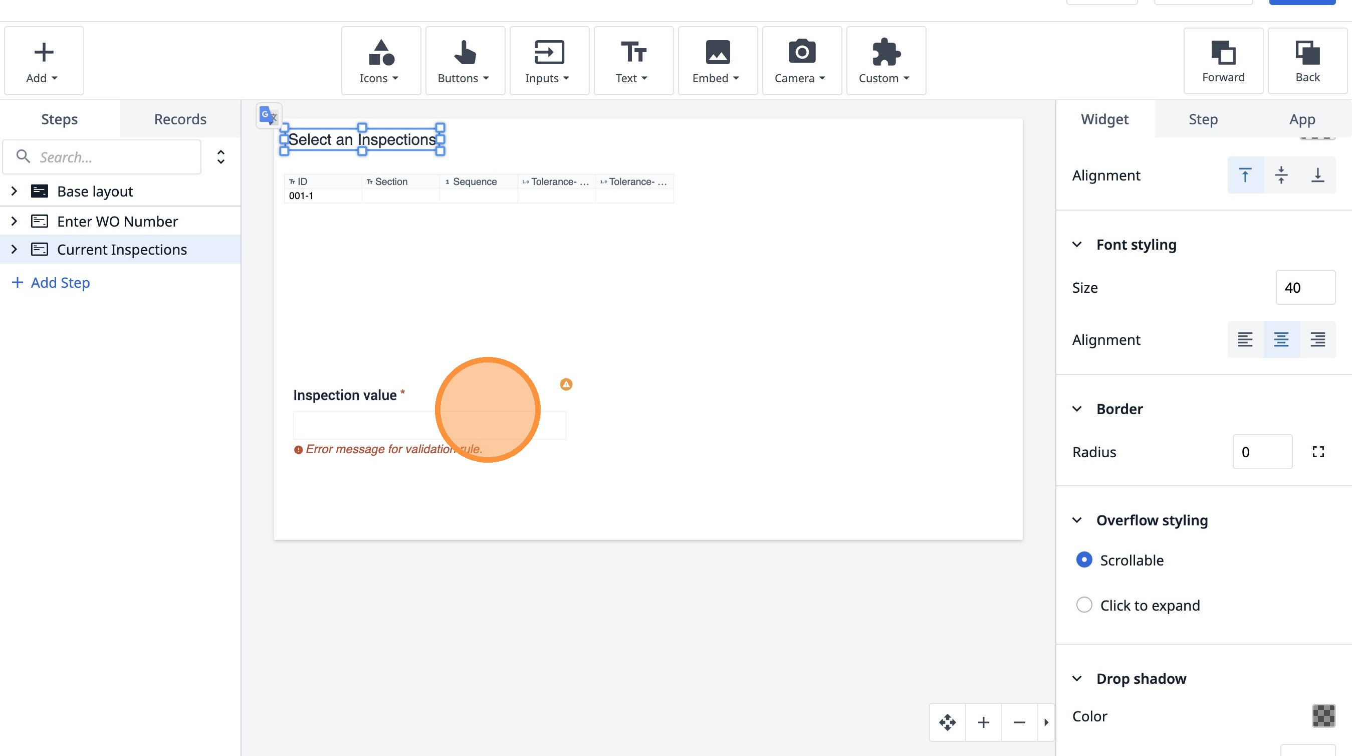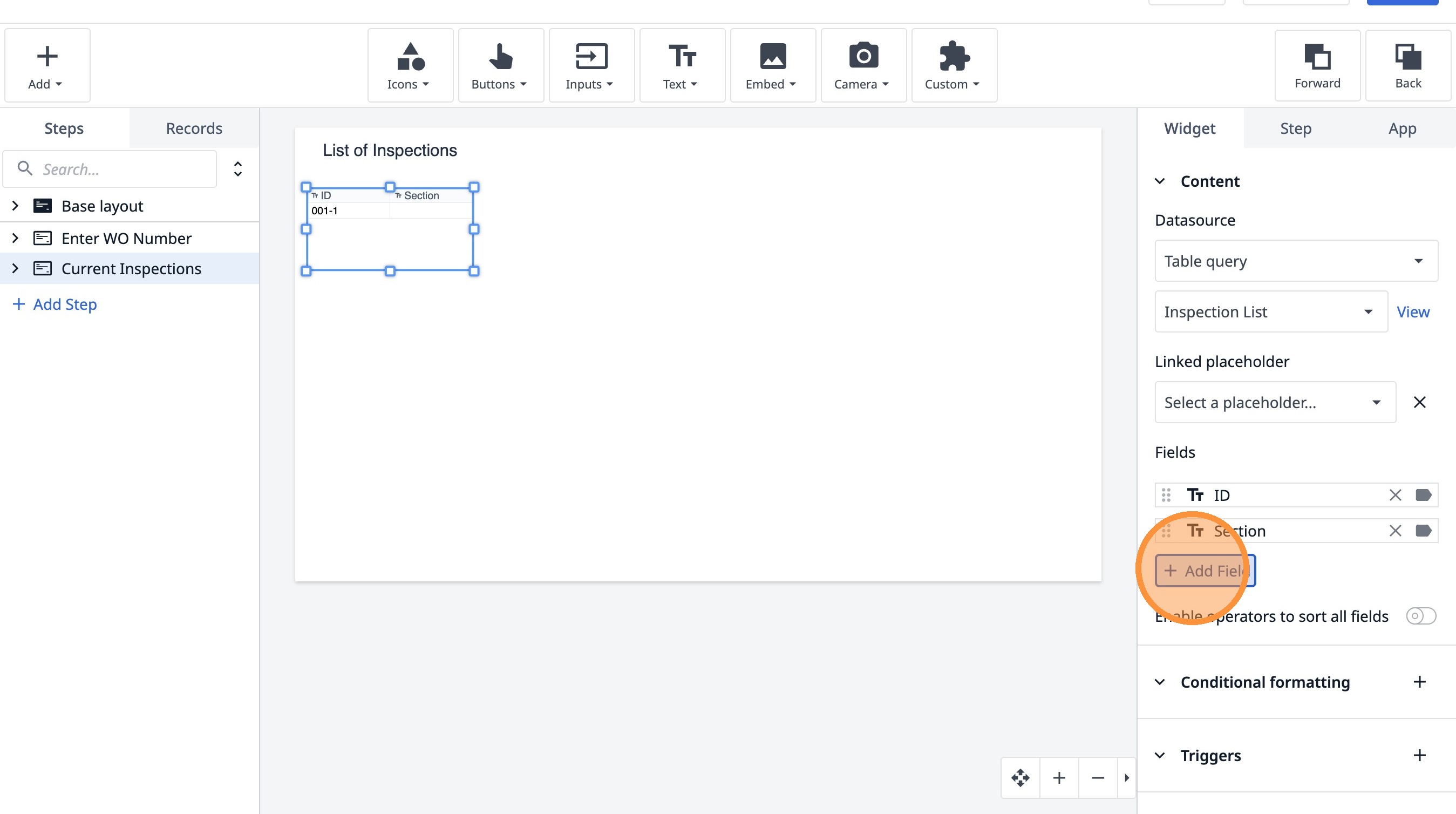 Learn how to build an interactive table widget to display inspection data. This guide will walk you through configuring a table to show inspection details and setting up dynamic data display for improved workflow visualization.