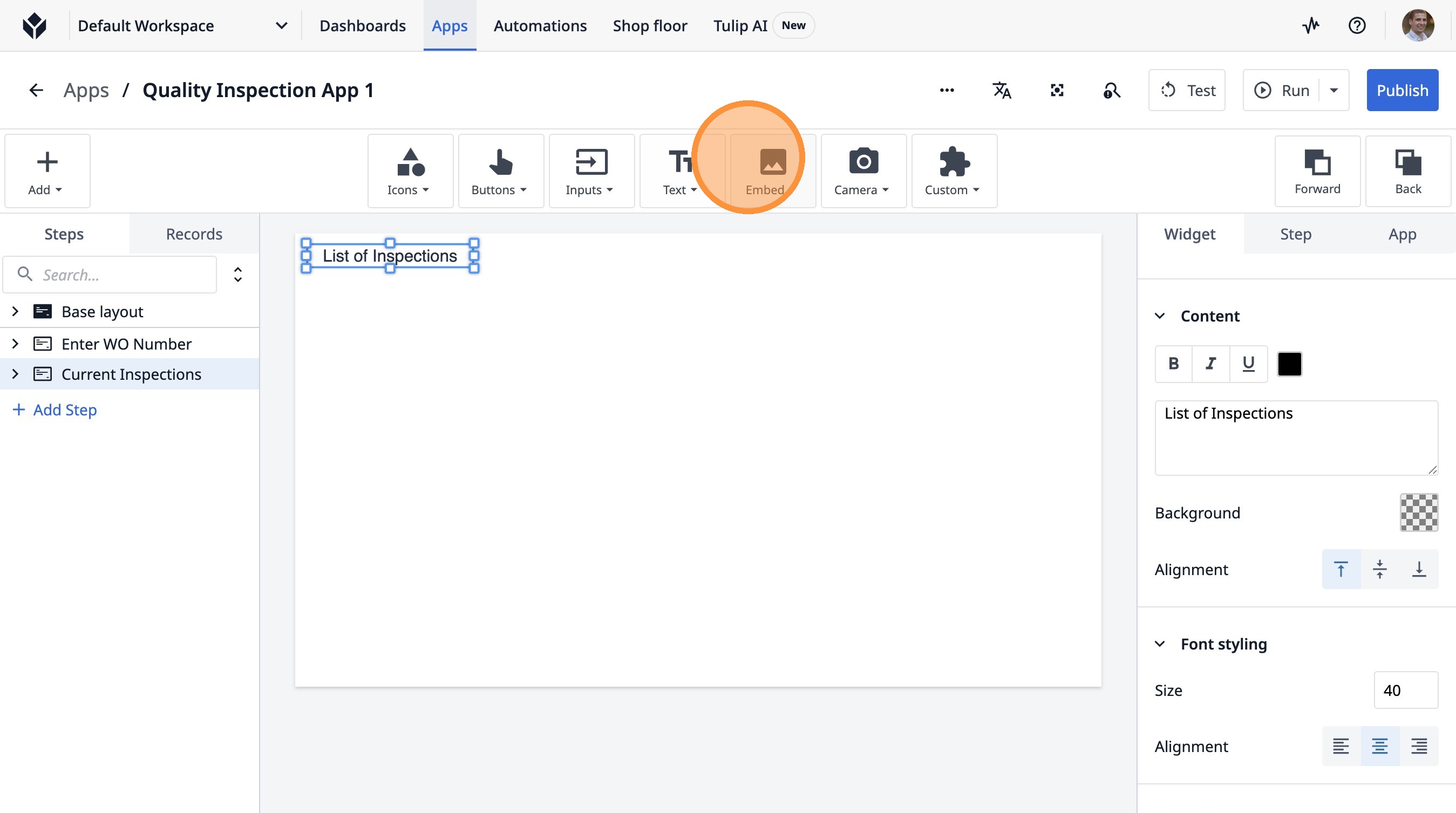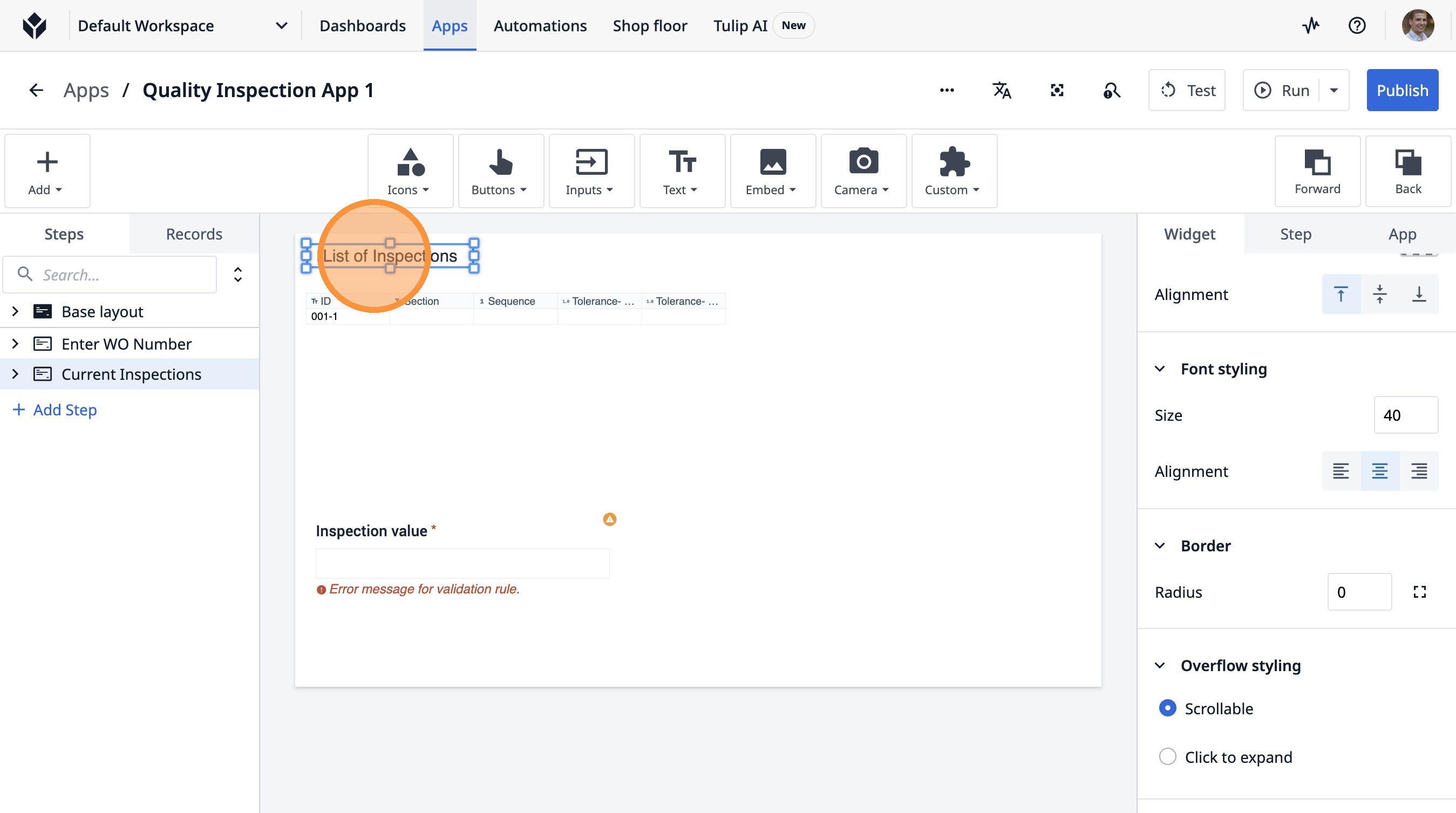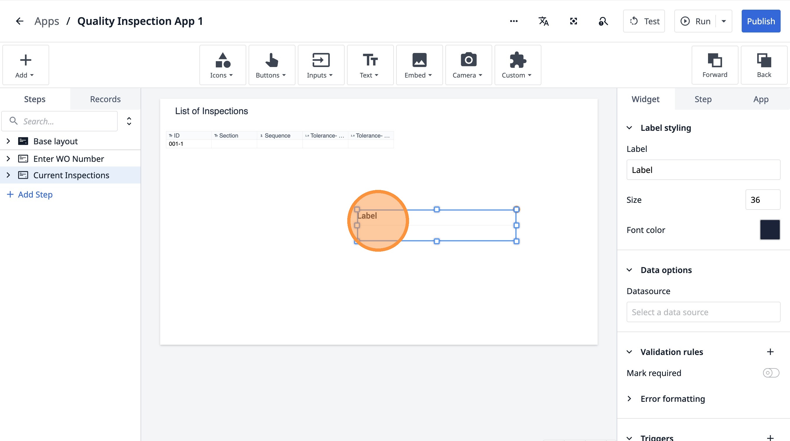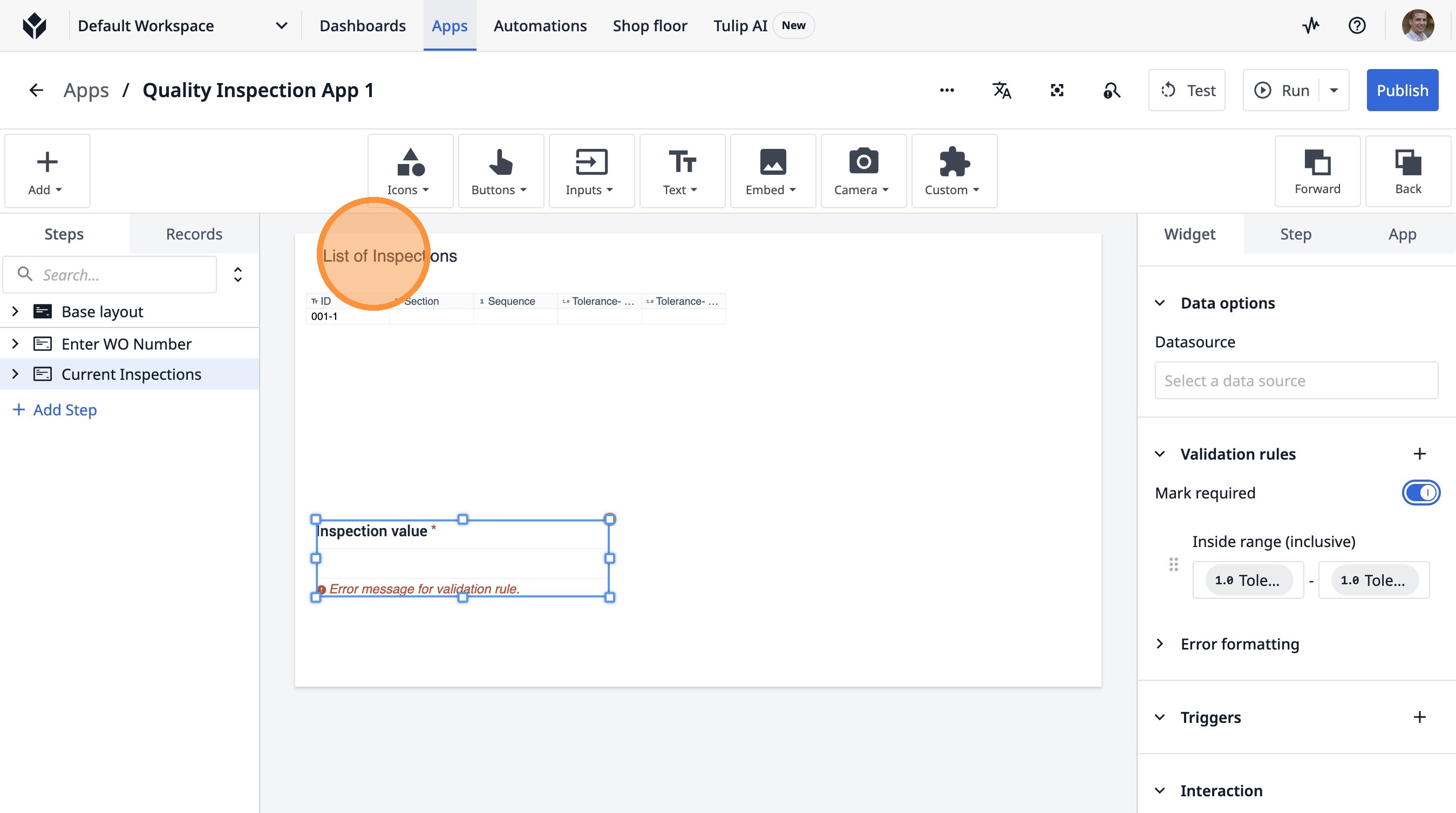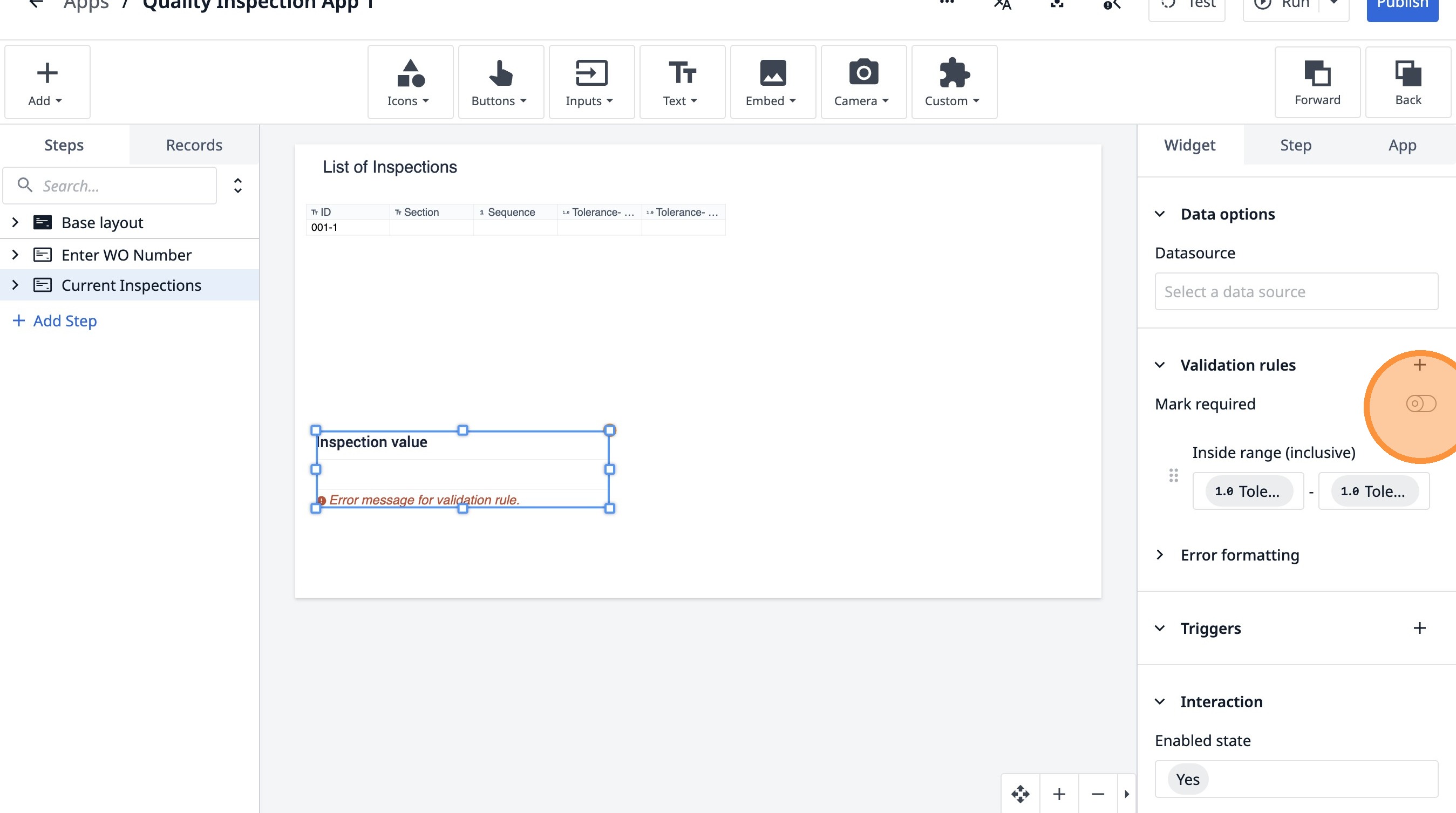 Learn how to build an interactive table widget to display inspection data. This guide will walk you through configuring a table to show inspection details and setting up dynamic data display for improved workflow visualization.