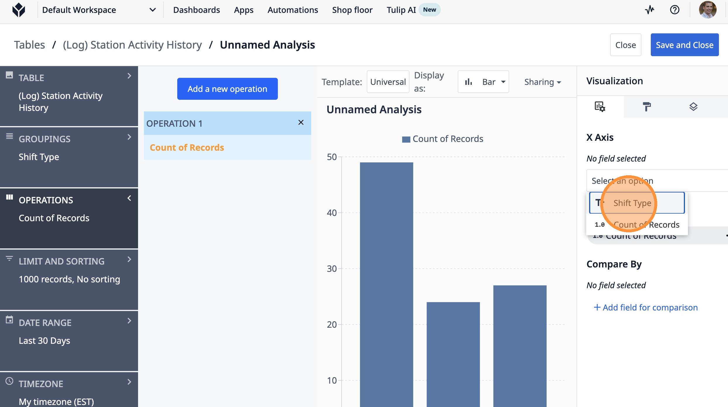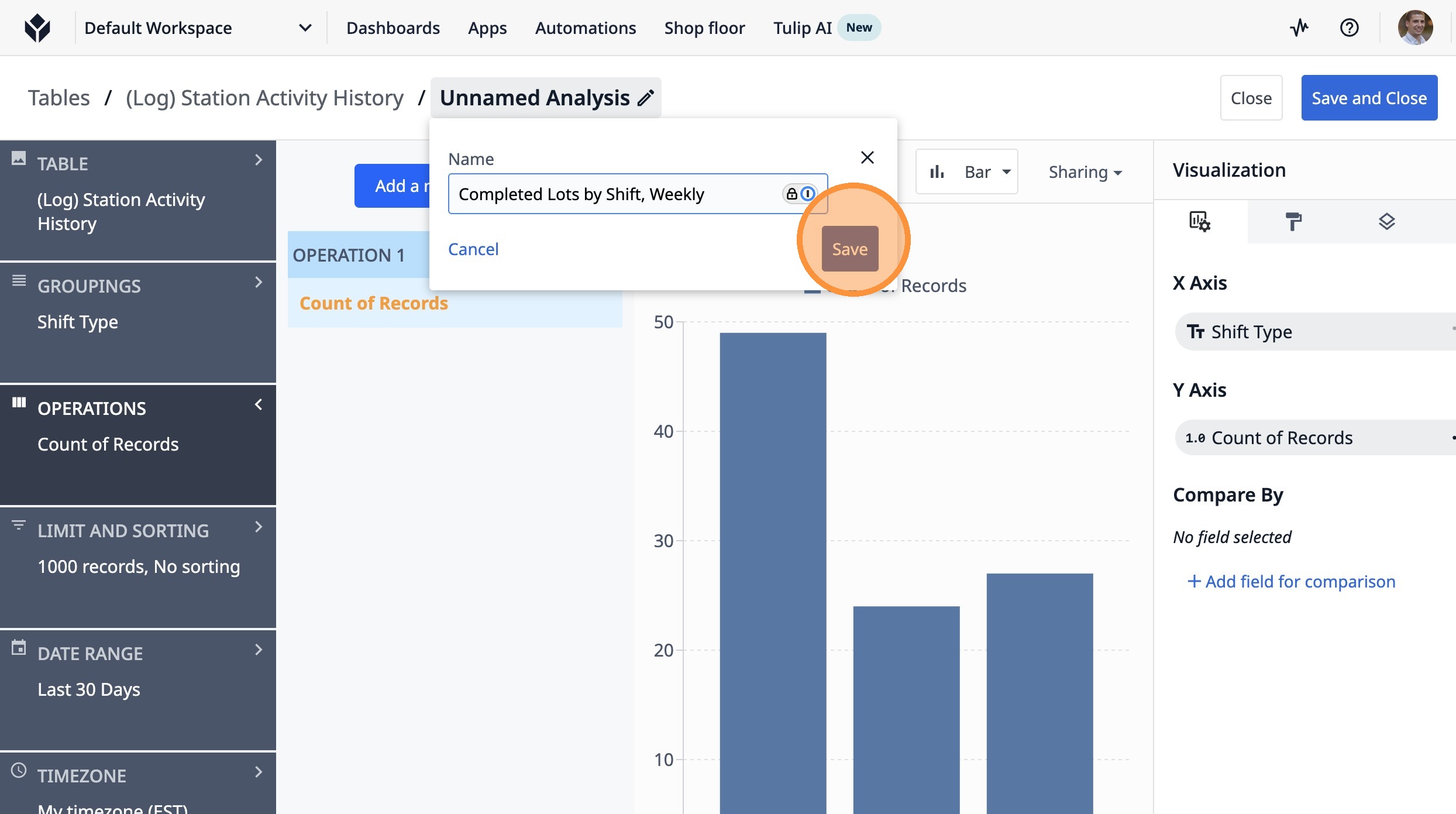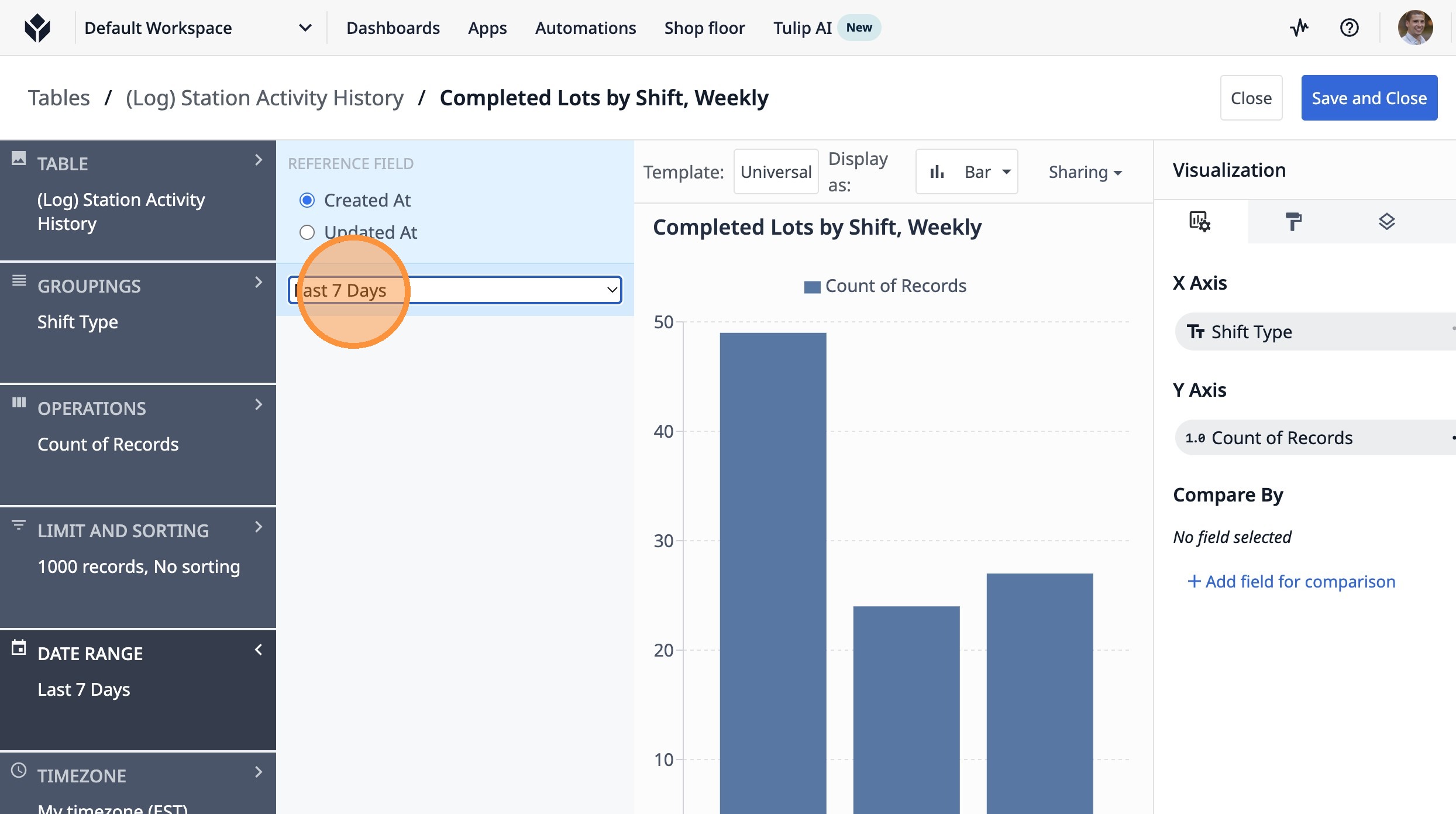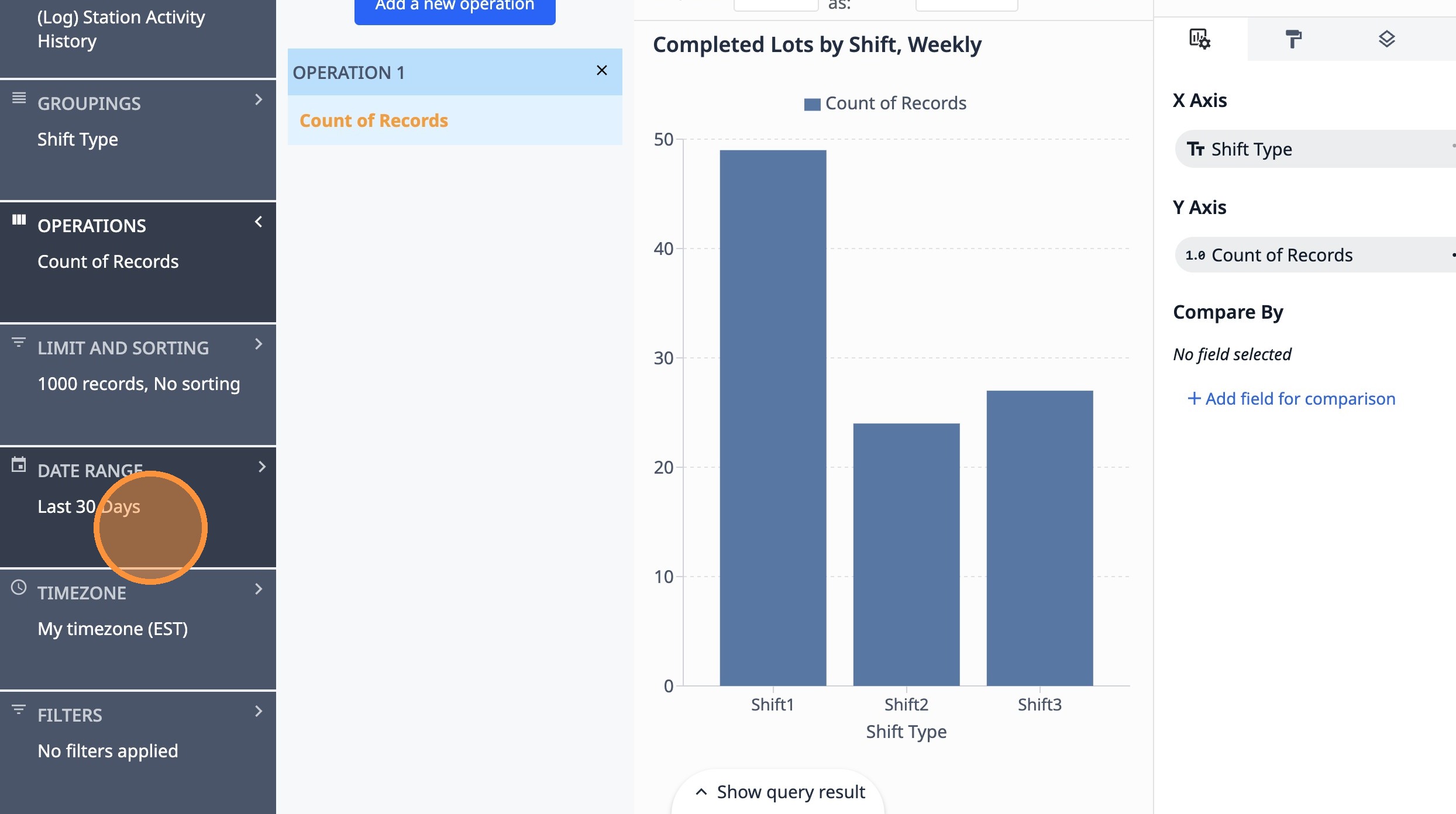 This guide will walk you through setting up a count of completed lots by shift type over the last 7 days.