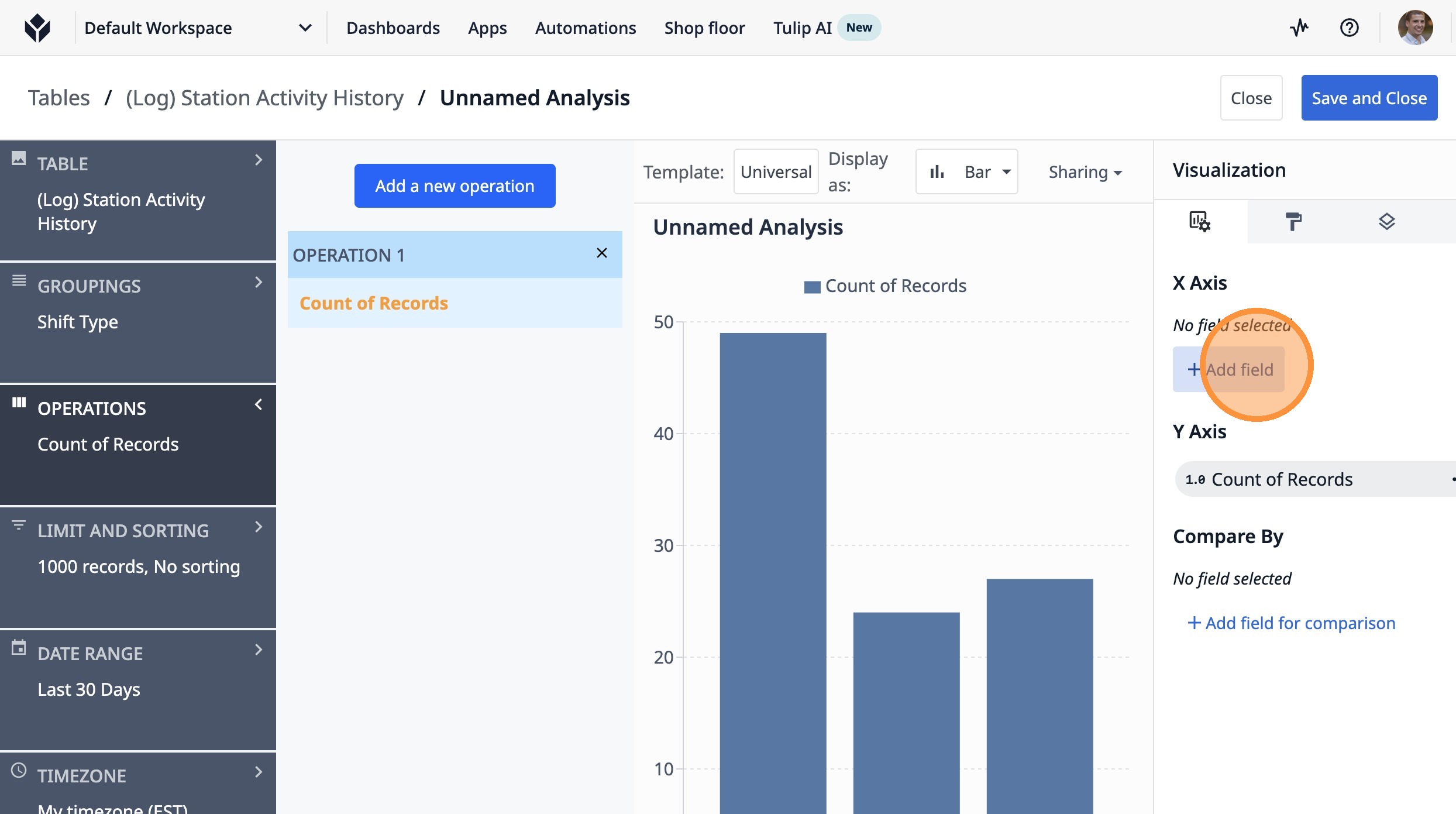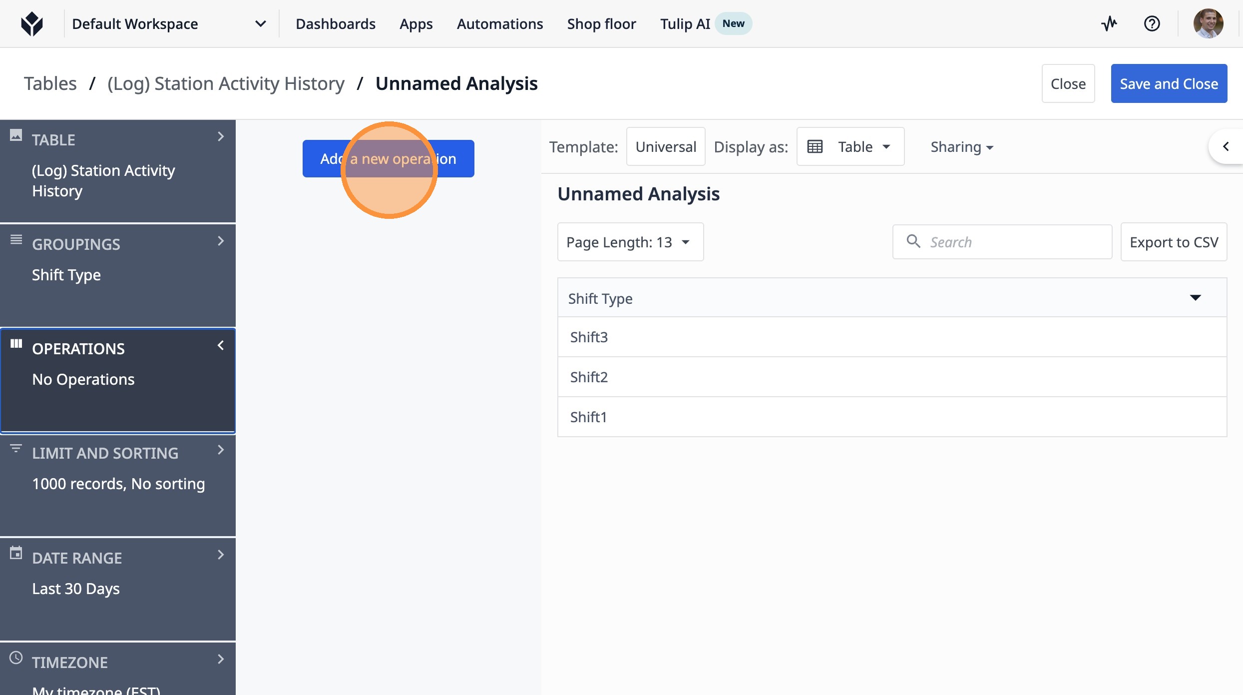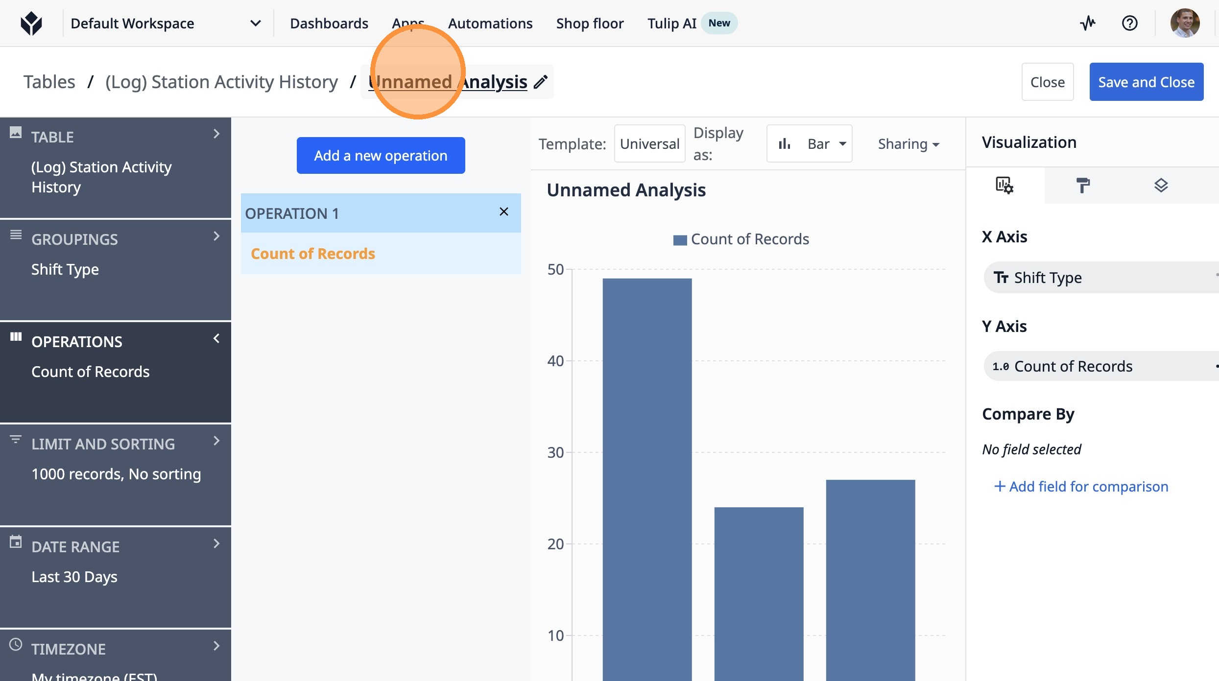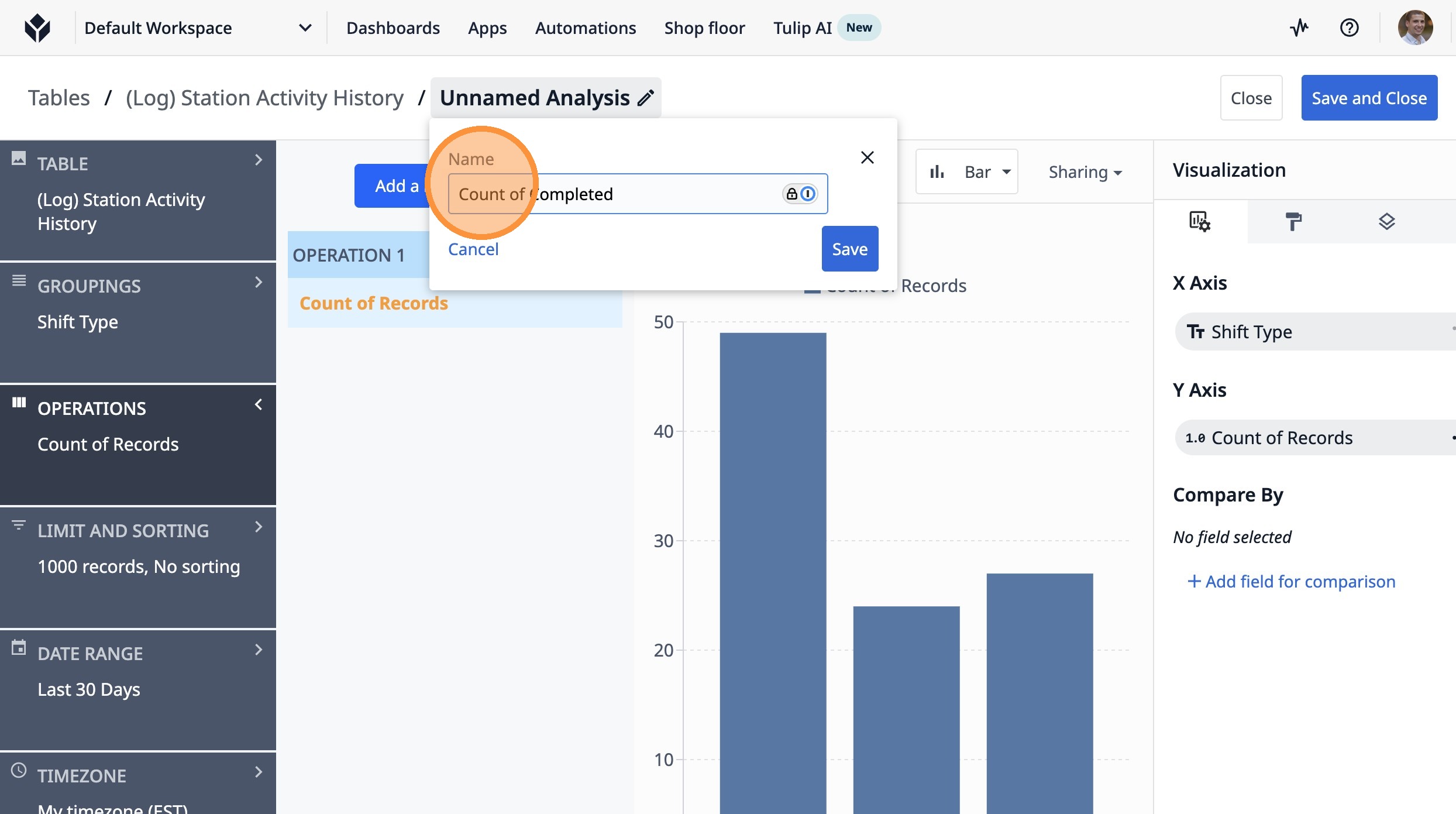 This guide will walk you through setting up a count of completed lots by shift type over the last 7 days.